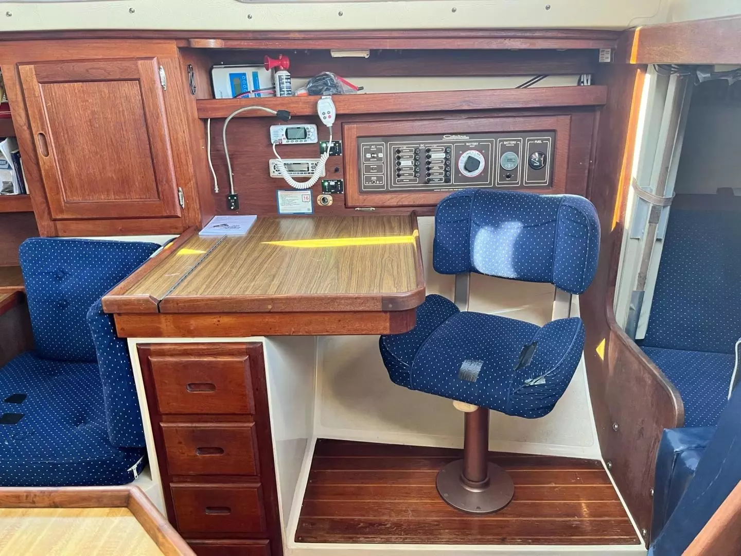 The area aft of the salon is to starboard a navigation station equipped with a chart table and captain's chair. The Master panel for 110V and 12V is adjacent to the Nav station.
