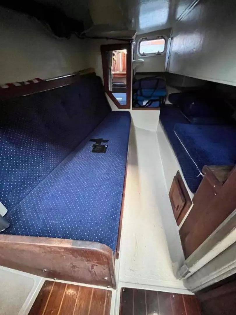 Vela has a comfortable V-Berth with lots of storage and a hanging locker. In the Salon there is a U-shaped dinette that converts into a double berth and a unique second dinette to starboard that also turns into a single berth.