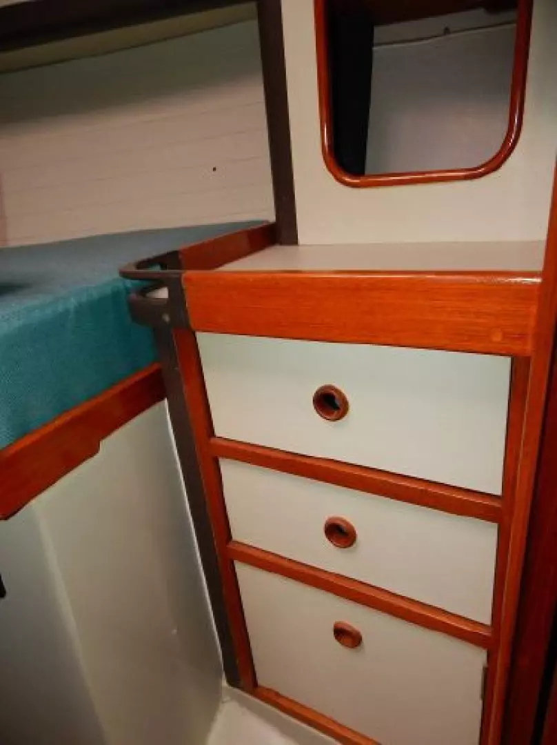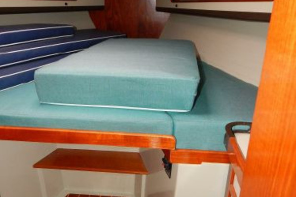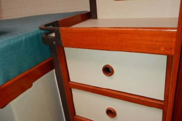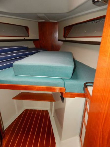 Furthest forward is the V-berth with filler, storage shelves outboard, storage drawers and cabinet shelves aft to starboard.