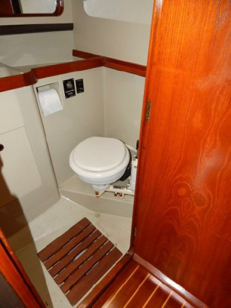 Next aft to port is the enclosed head and a hanging locker to starboard.