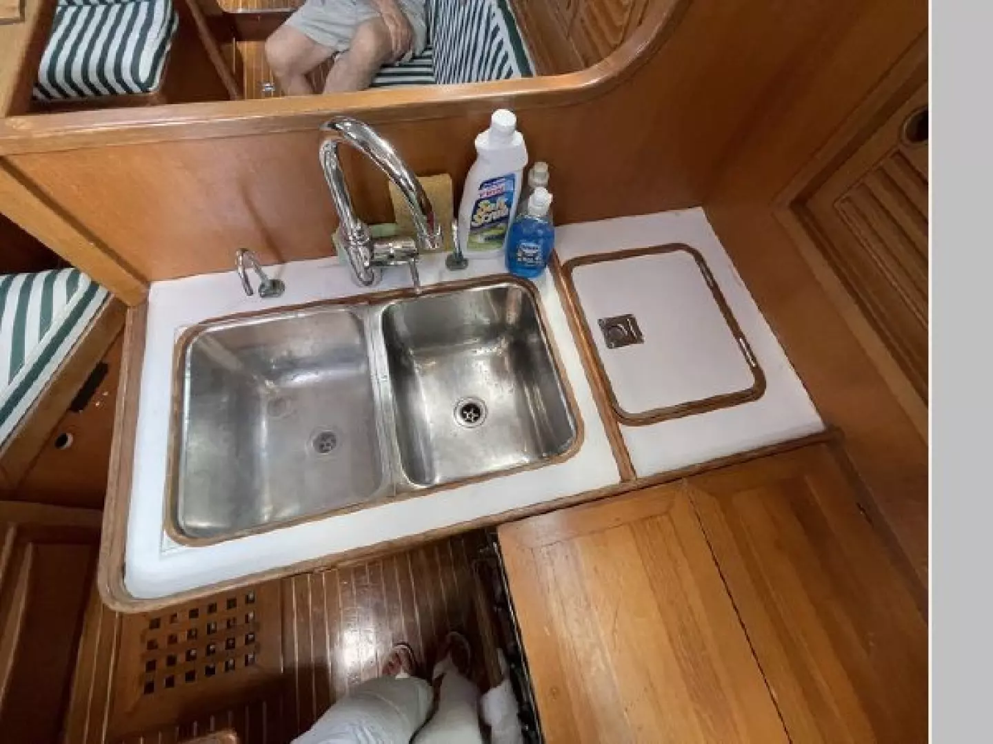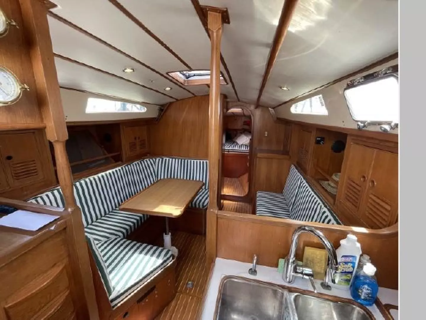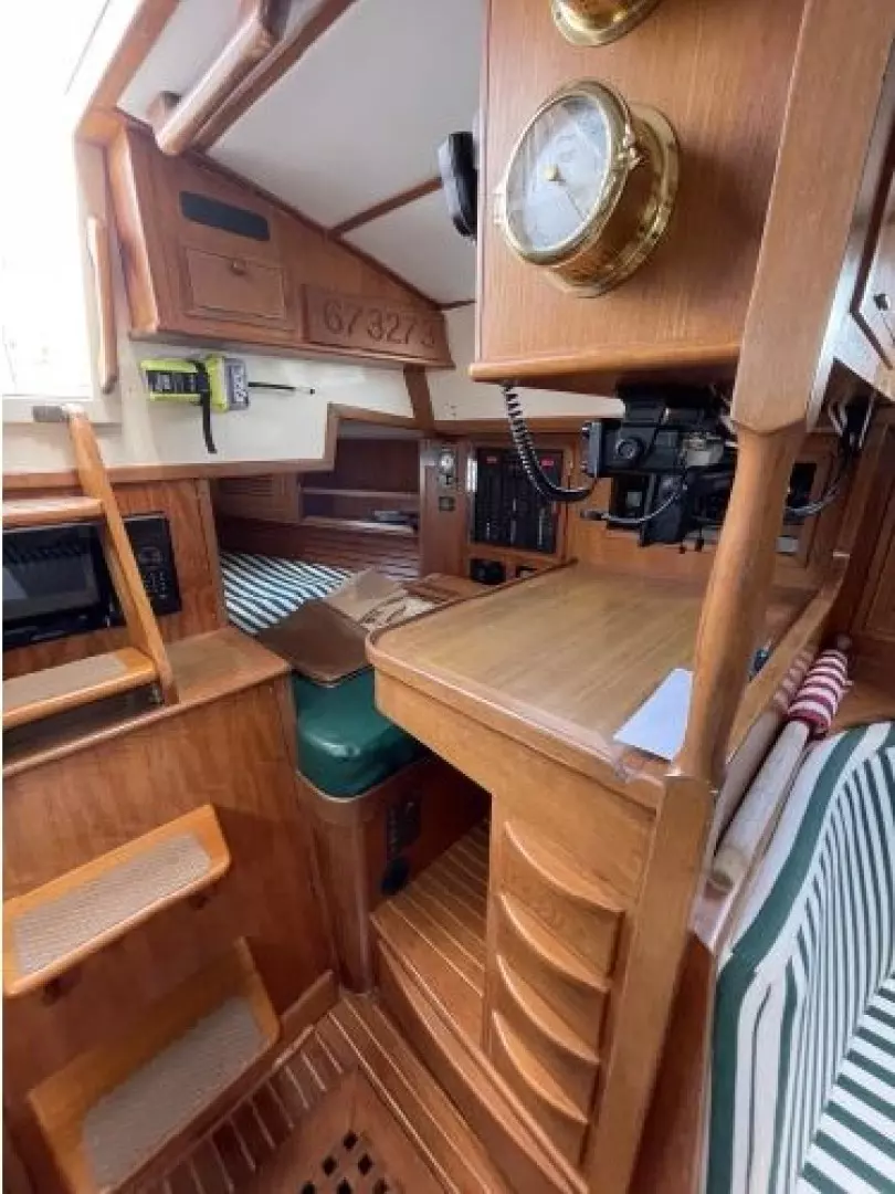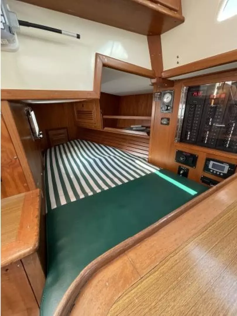 Heading aft you enter the Main salon with 6'5" headroom; Here she has the traditional feel of a fine yacht with a U-shaped dinette to port with fixed table and a settee opposite to STB. The settee pulls out making for a larger sleeping berth and offers abundant storage behind as well as outboard shelves. There is additional shelving behind the dinette as well. Tanks are located under the seating areas. Aft of the dinette on port is her large Navigation station, electronics and electric panel followed by a double quarter berth. Aft of the STB settee is her L-shaped galley. Her companionway leads to the cockpit and also serves as access to the engine compartment.