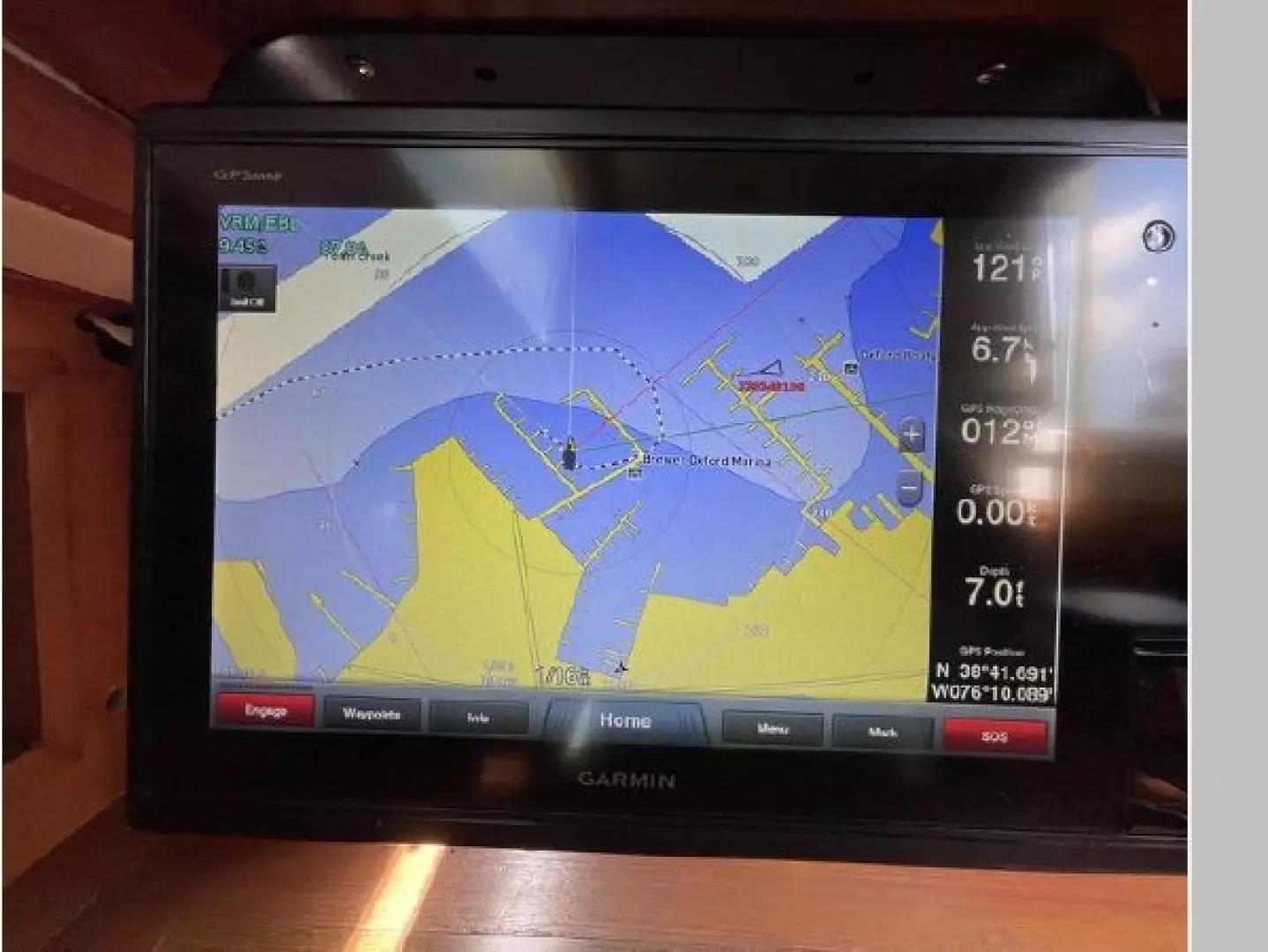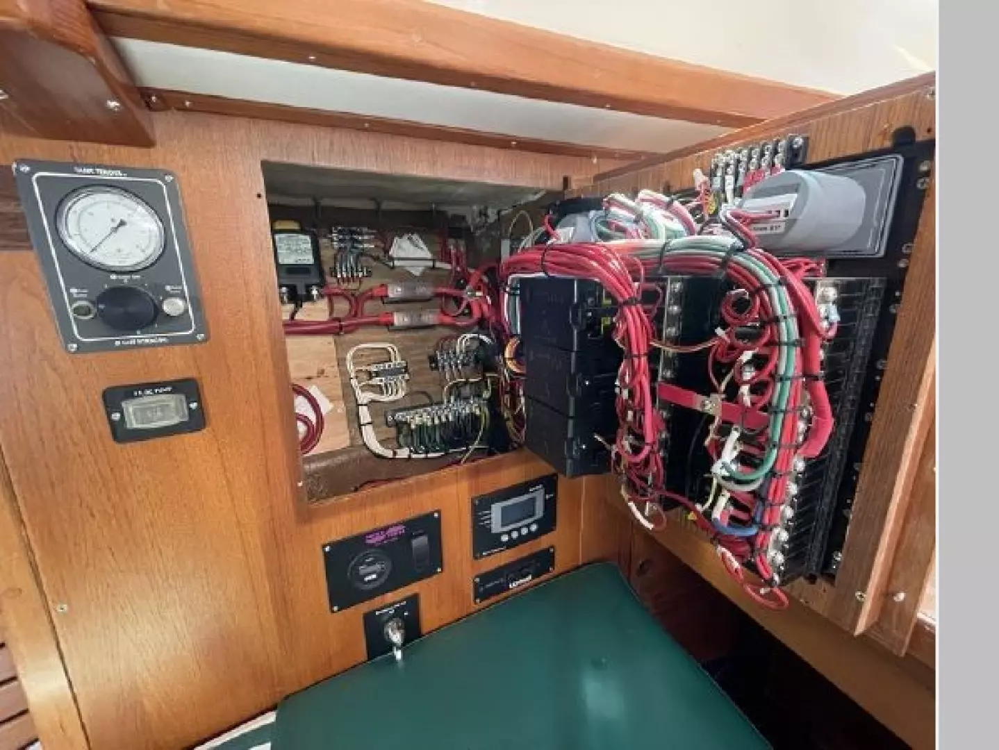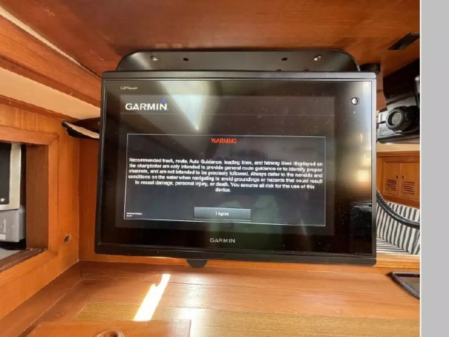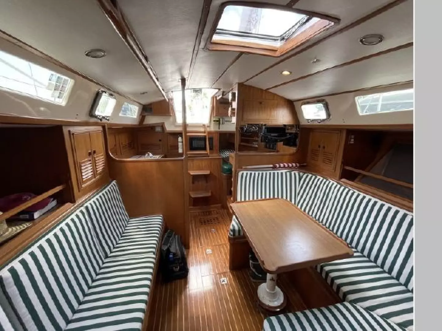 Heading aft you enter the Main salon with 6'5" headroom; Here she has the traditional feel of a fine yacht with a U-shaped dinette to port with fixed table and a settee opposite to STB. The settee pulls out making for a larger sleeping berth and offers abundant storage behind as well as outboard shelves. There is additional shelving behind the dinette as well. Tanks are located under the seating areas. Aft of the dinette on port is her large Navigation station, electronics and electric panel followed by a double quarter berth. Aft of the STB settee is her L-shaped galley. Her companionway leads to the cockpit and also serves as access to the engine compartment.