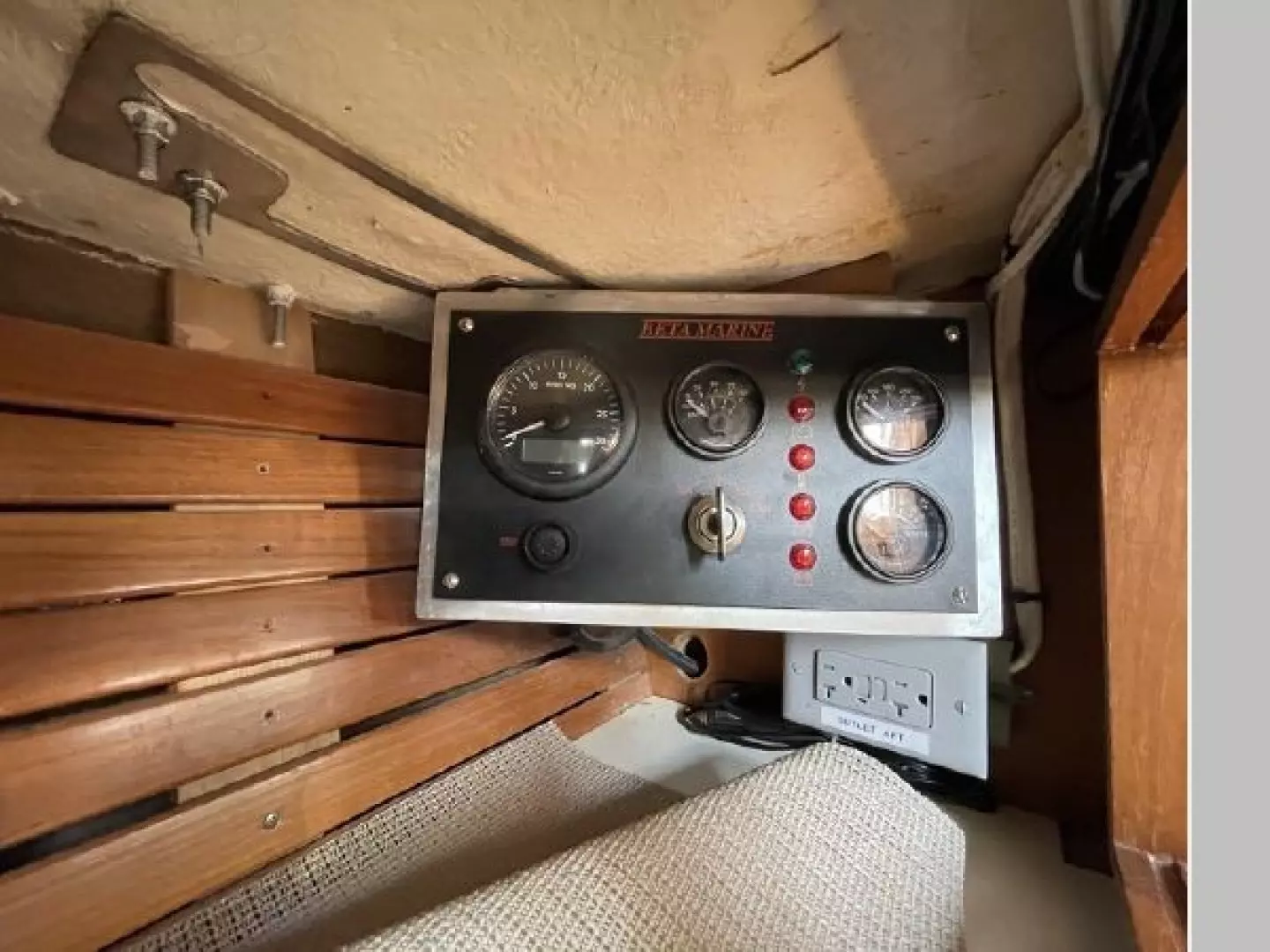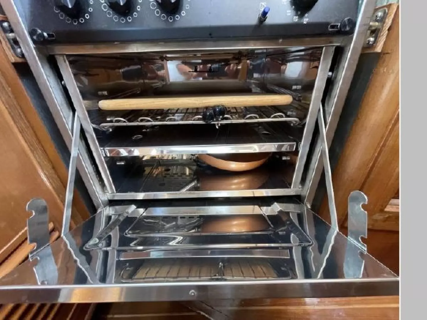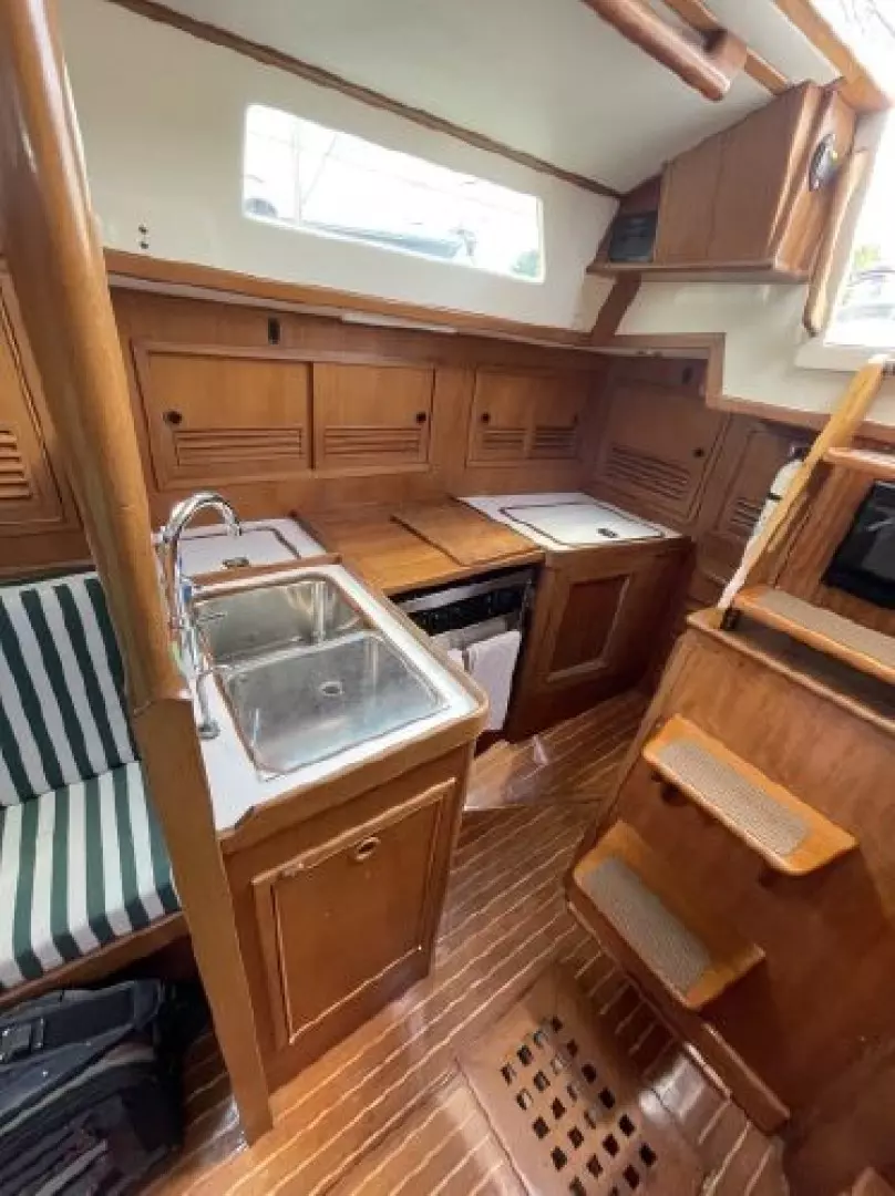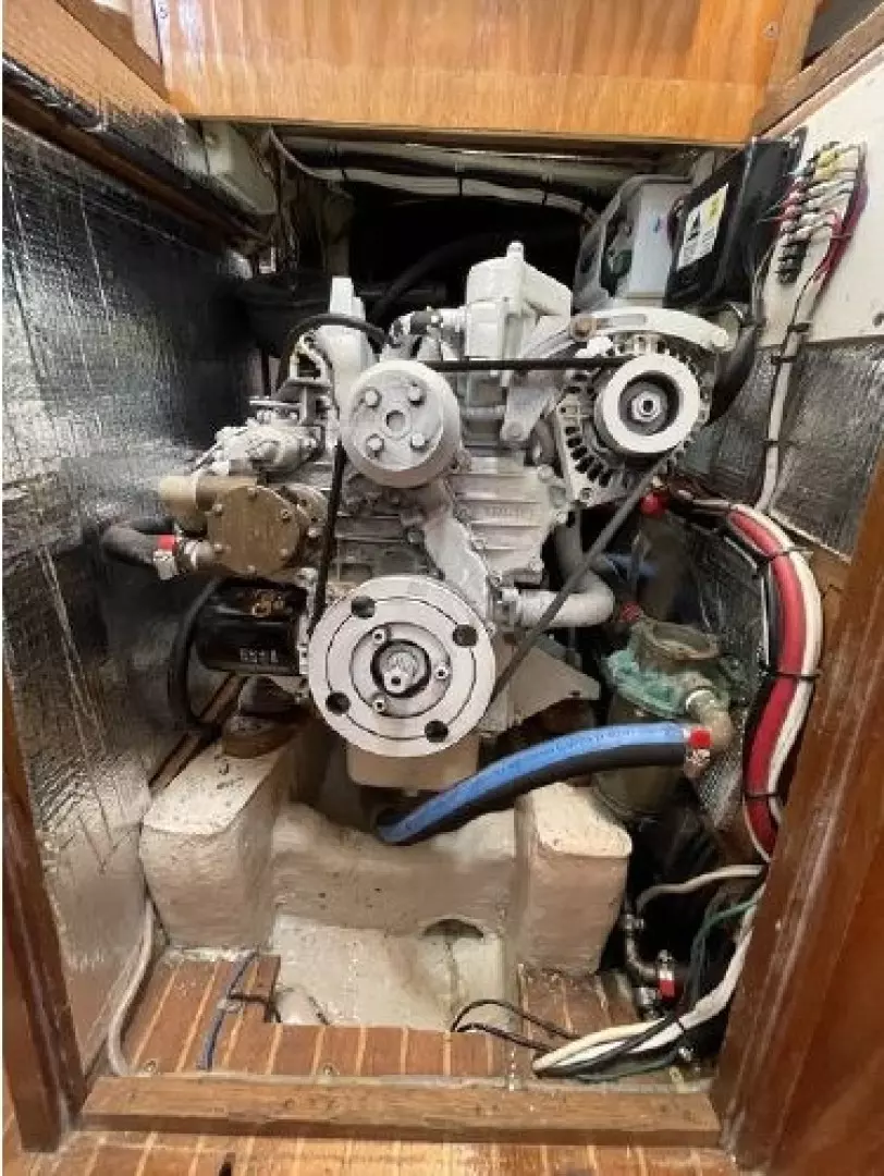 Heading aft you enter the Main salon with 6'5" headroom; Here she has the traditional feel of a fine yacht with a U-shaped dinette to port with fixed table and a settee opposite to STB. The settee pulls out making for a larger sleeping berth and offers abundant storage behind as well as outboard shelves. There is additional shelving behind the dinette as well. Tanks are located under the seating areas. Aft of the dinette on port is her large Navigation station, electronics and electric panel followed by a double quarter berth. Aft of the STB settee is her L-shaped galley. Her companionway leads to the cockpit and also serves as access to the engine compartment.