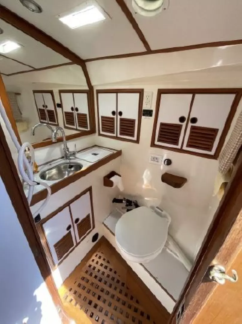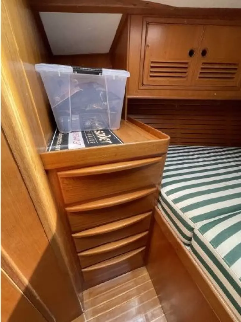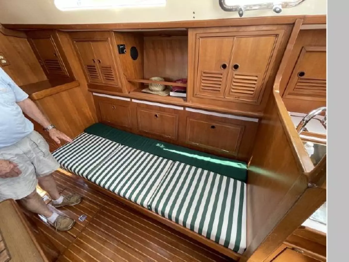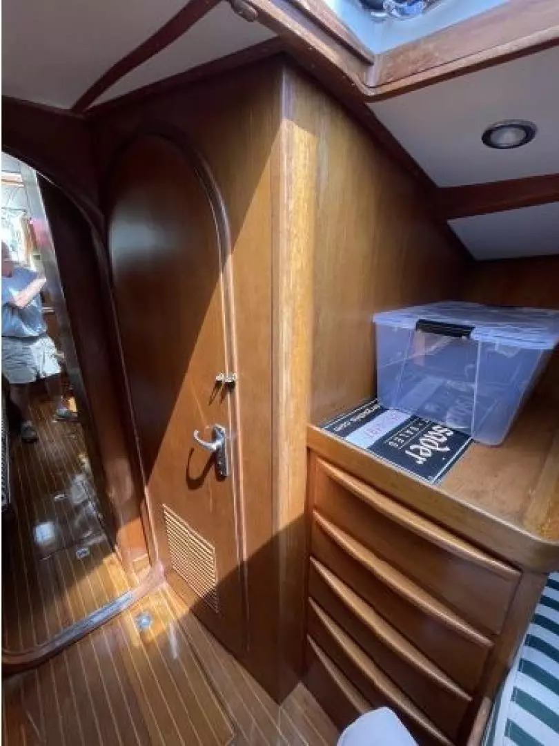 She has a lovely, traditional interior configuration with the FWD cabin interior arrangement. A nice large master stateroom is forward with V-berth and numerous drawers and lockers for extended voyages. She has shelving outboard of the berth as well as a 5 drawer credenza to port followed by the private access to the head. On STB she has a 4 drawer credenza as well as a hanging locker. Large hatch above for ventilation, teak cabinetry, teak and holly sole and offers 6'2" headroom.