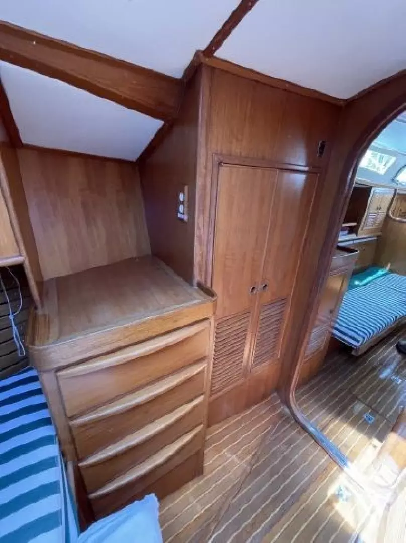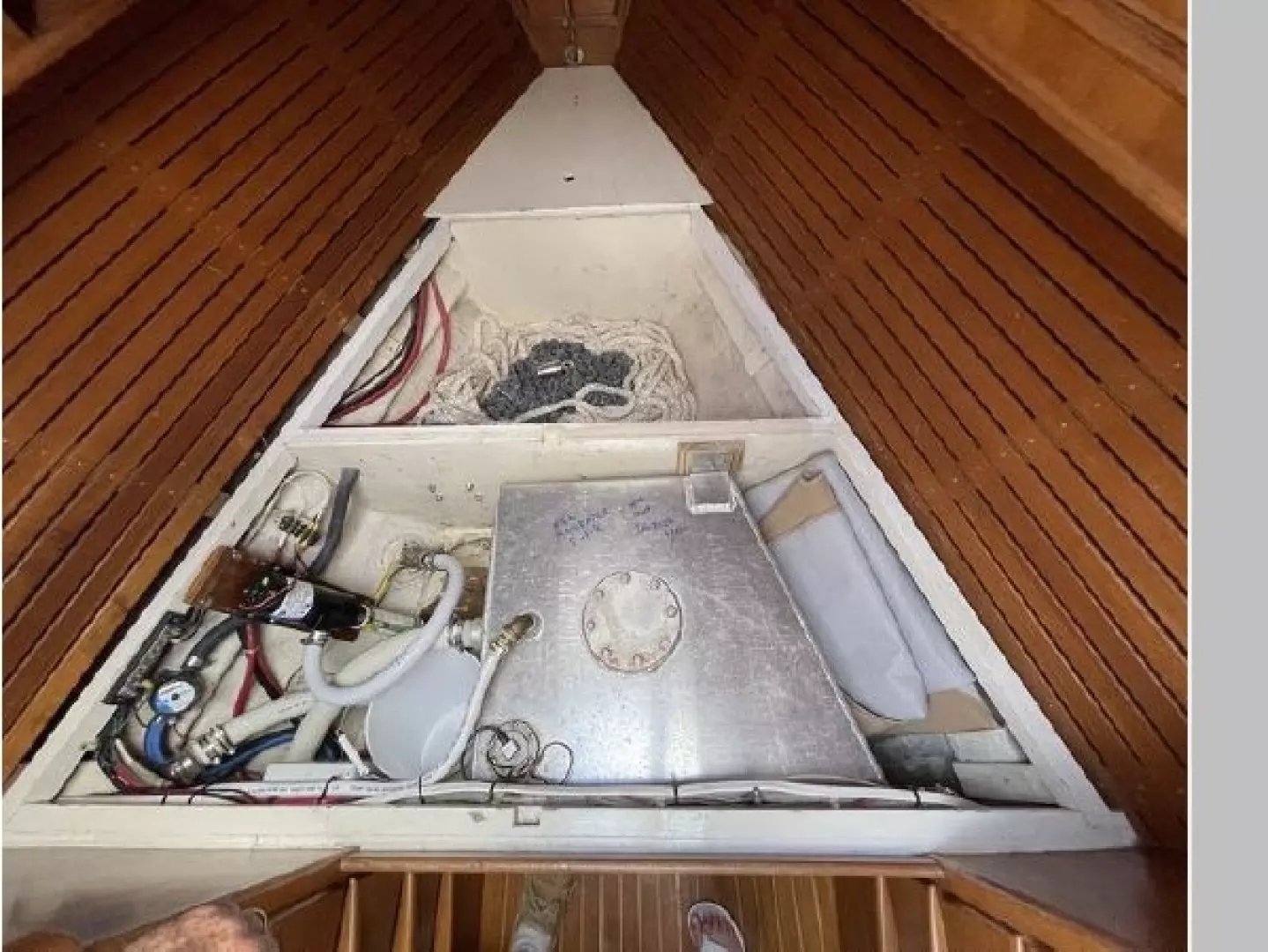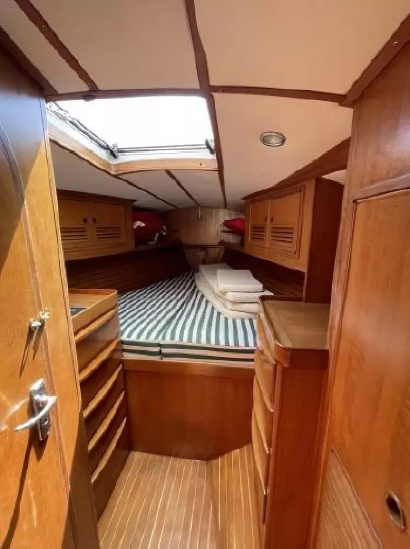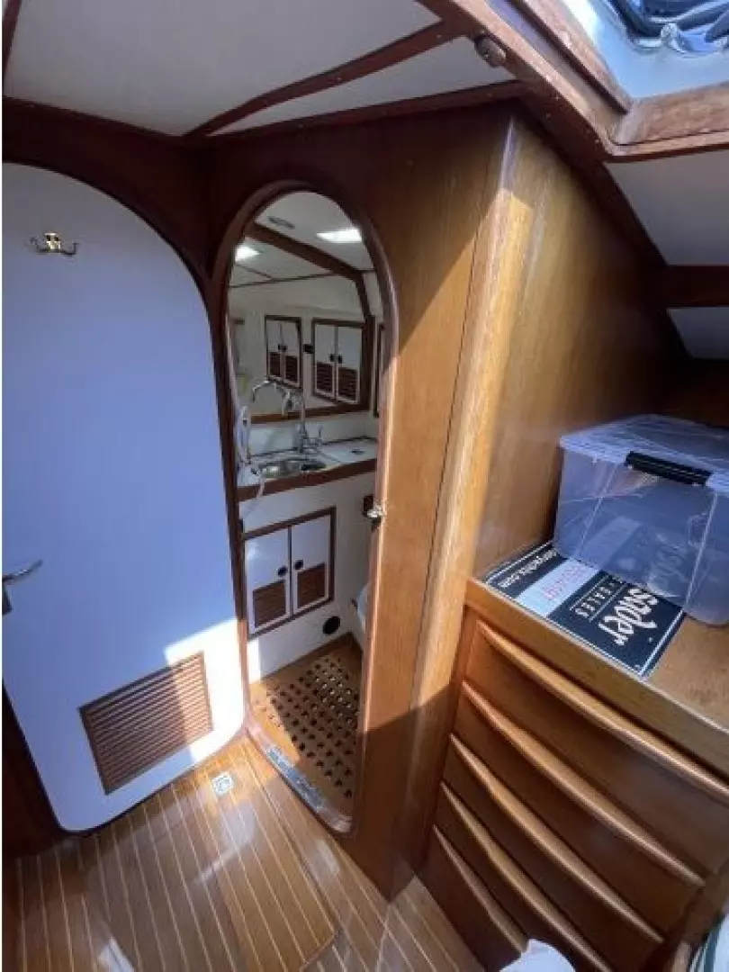 She has a lovely, traditional interior configuration with the FWD cabin interior arrangement. A nice large master stateroom is forward with V-berth and numerous drawers and lockers for extended voyages. She has shelving outboard of the berth as well as a 5 drawer credenza to port followed by the private access to the head. On STB she has a 4 drawer credenza as well as a hanging locker. Large hatch above for ventilation, teak cabinetry, teak and holly sole and offers 6'2" headroom.
