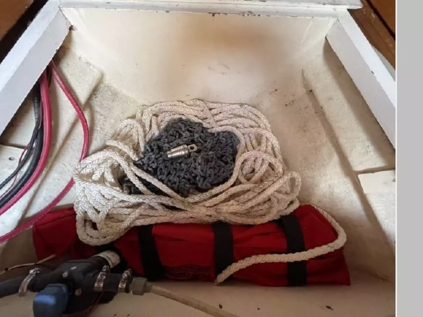 - 200' of Yale 5/8" braid fastened to a U-bolt in the rode locker