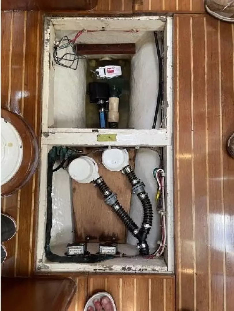 - Marinco 30amp shore power inlet outside the cockpit coaming on the port side, aft.