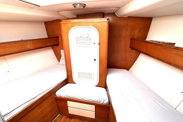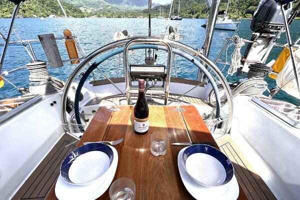 A classic sloop-rigged cruiser, Diatomée offers comfortable accommodation for up to eight guests across four cabins, one queen, two doubles, one single, plus a drop-down saloon berth. She features three bathrooms, each with electric heads and showers, a functional galley with ENO electric stove and oven, and Webasto heating throughout.