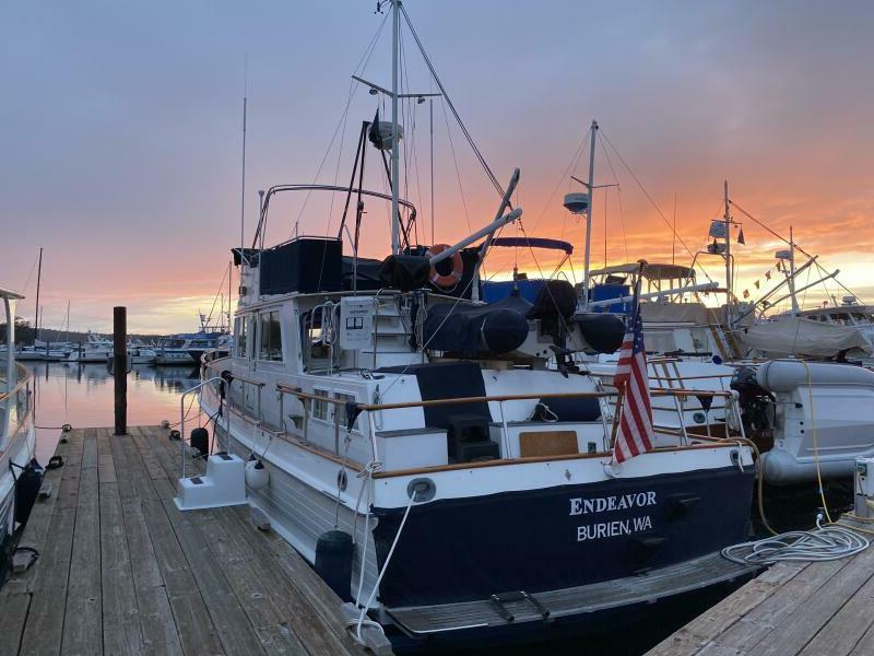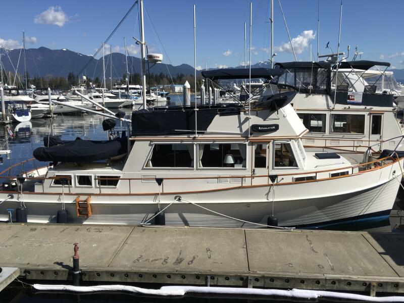 Boathouse-kept Grand Banks 42 Classic with spacious salon, excellent visibility, fore and aft staterooms with ensuite heads, twin Ford Lehman diesels, and well-lit engine room. Includes Lohman moorage cover and optional Tacoma boathouse.