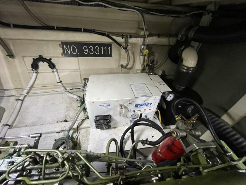 Access is through either floor hatches in main salon or door located behind stairs to the forward stateroom. Compartment contains all main systems including tankage, engines, generator, batteries, refrigeration.