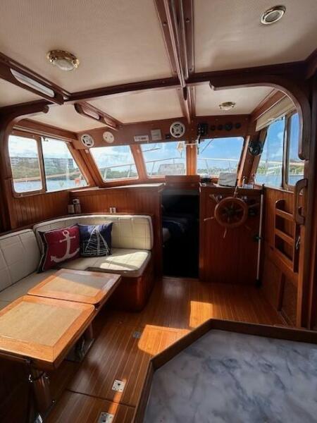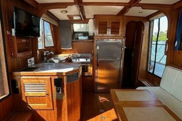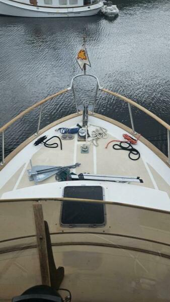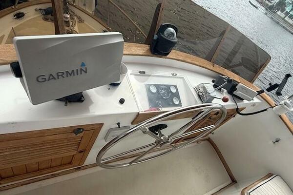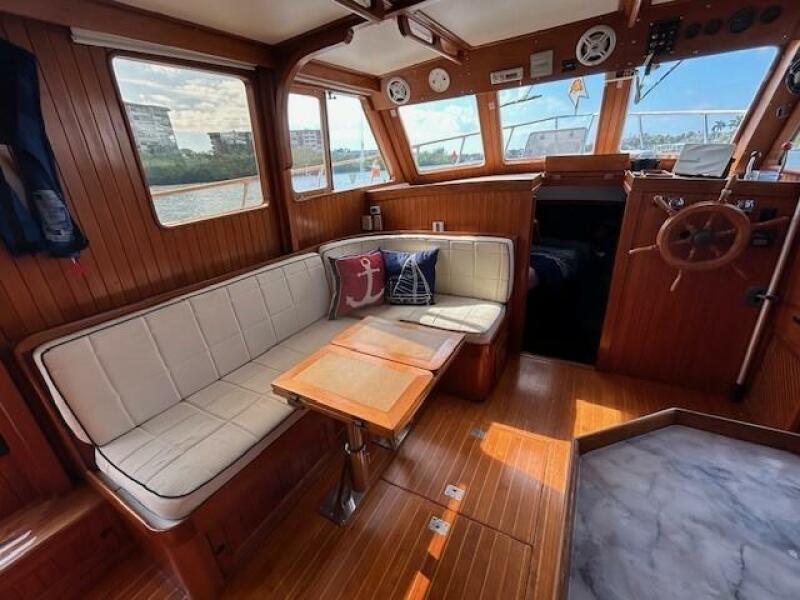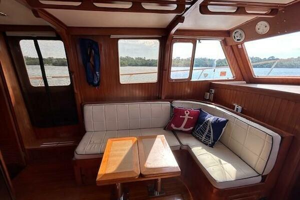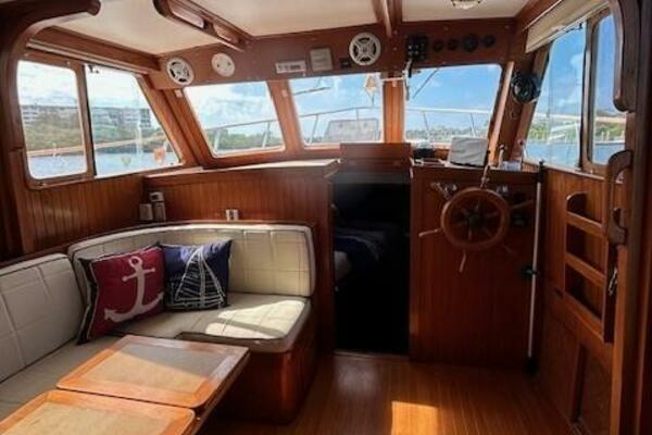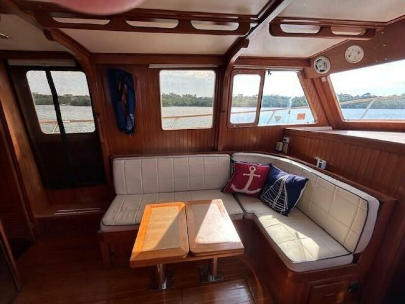 Wallagrass is an aft-cabin trawler that balances comfort and seaworthiness. The Ed Monk designed semi-displacement hull is powered by a single Perkins TW6-354.4 diesel engine and a Westerbeke 7.6 kW Generator. Her bow is tall, and plenty of freeboard from stem to stern. With a large flybridge and a lower helm in the salon, it offers good views all around the boat. Expansive side decks and rails all around are a plus for safety, and there's room for dinghy storage on the cabin top.