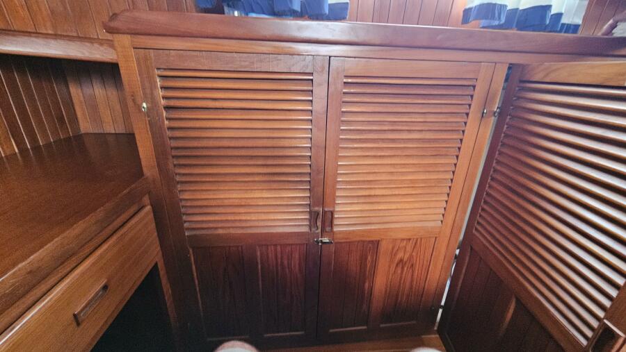 As you enter Wallagrass from her port, you have a large salon and a settee to port with a high/low tablet, the lower helm to the forward starboard, and the galley aft starboard. The aft will take you to the master stateroom with a queen-size berth, plenty of storage, and an en suite head with a dedicated bath/shower.. Forward, there is the second berth with a pullman and an adjacent head.