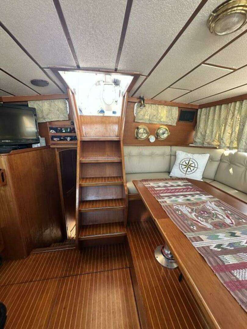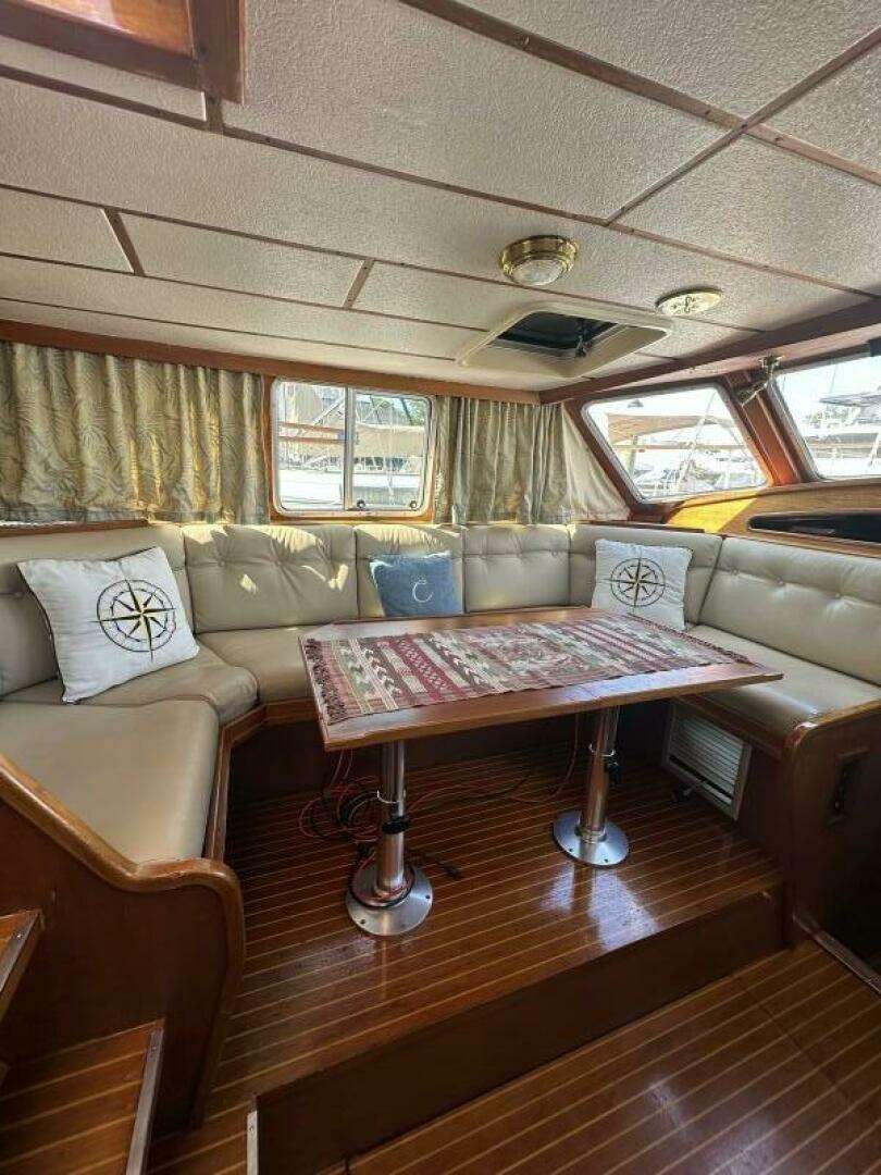 - Up a couple of steps and one enters her Main Salon/Pilot house with lower helm station. She has a large, raised, U-shaped dinette to port and table. The table drops to convert the dinette to a large double berth. To Starboard is the helm and nav station. Excellent 360 degree views from all her large windows. Beige colored Ultra-leather fabric for the dinette, teak and holly sole and curtains for privacy when needed. She has a very inviting interior. Aft centerline steps lead to her cockpit and second helm station. Aft to starboard is the walk way to the Aft Master Cabin. The floor in the salon all opens up for easy access to the engine compartment.