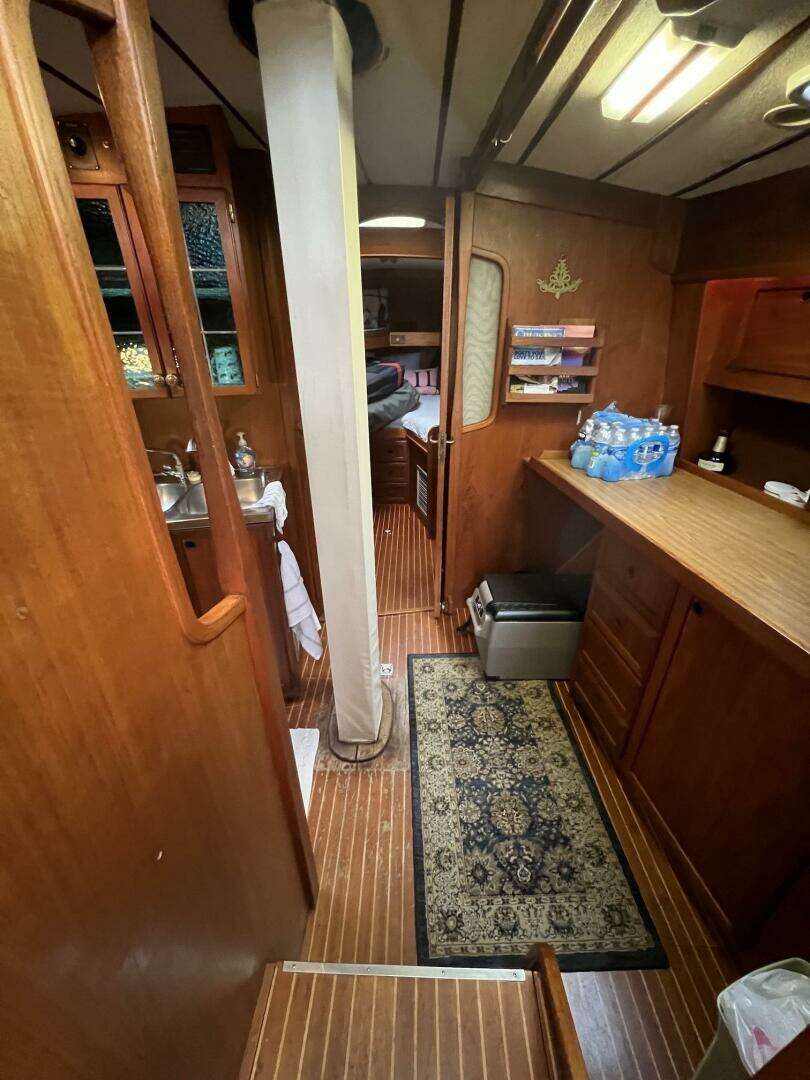 - Moving aft from the Guest cabin one enters the large Sea Galley to port. Opposite to Starboard is additional counter and storage space for long term cruising.