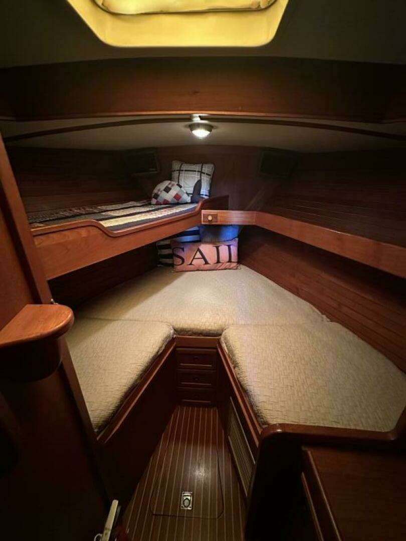 - The guest stateroom is forward and has a double V-berth as well as an additional single skipper berth. There is also a quest head with shower aft with hanging lockers opposite to Starboard.
