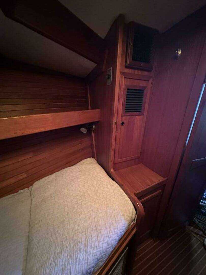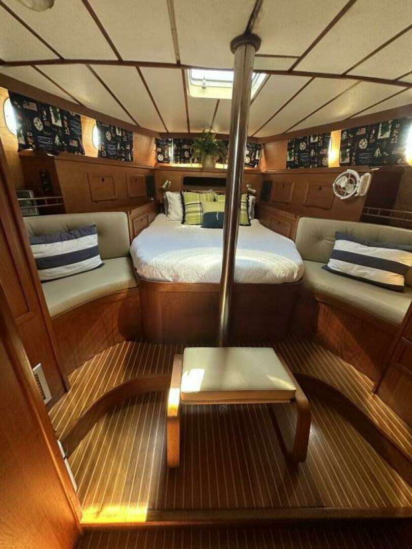 - As one enters the aft cabin you are impressed with the size and comfort. She has a centerline double berth and one step up raised seats on either side for relaxing or easier access to the berth. Here again there are abundant windows all around, and hatch above for excellent light and ventilation. Teak cabinetry throughout and teak and holly sole. To port is a dressing table and plenty of drawer storage. Hanging locker on forward bulkhead that also serves as an additional access door to the engine compartment. To starboard is the master head with separate show stall.