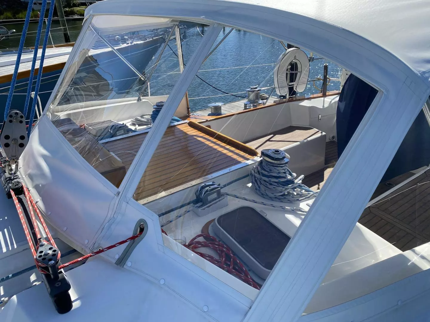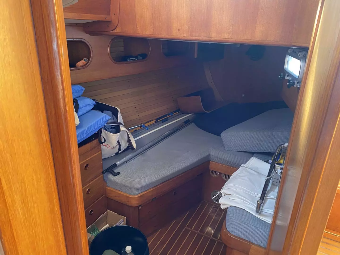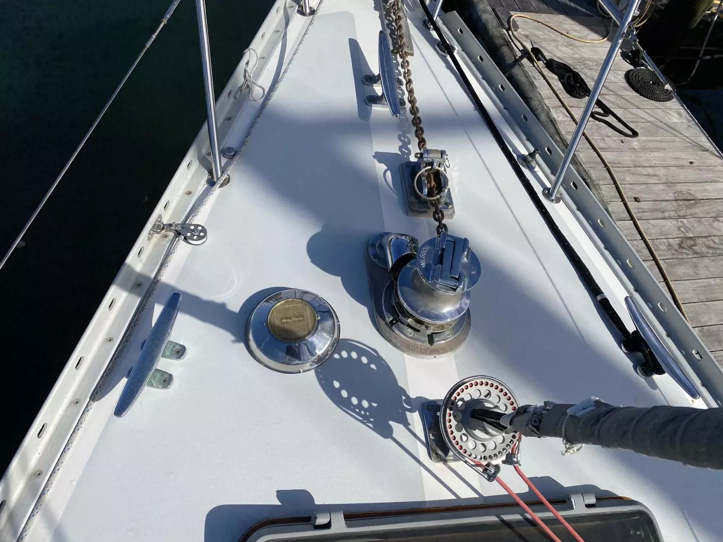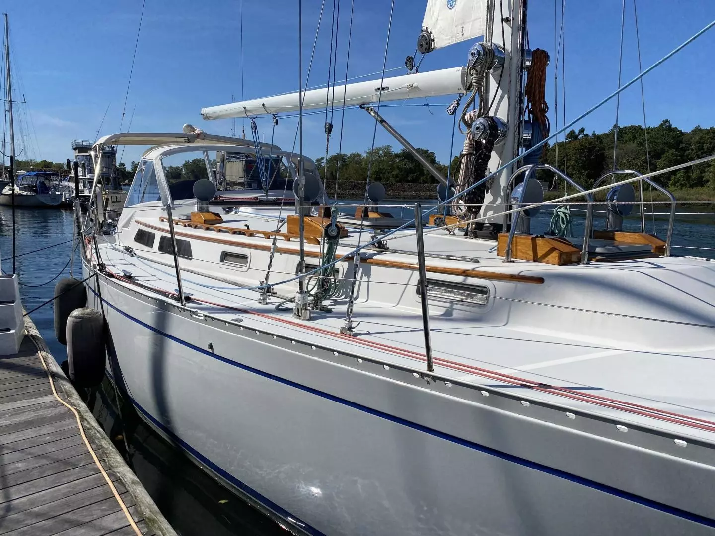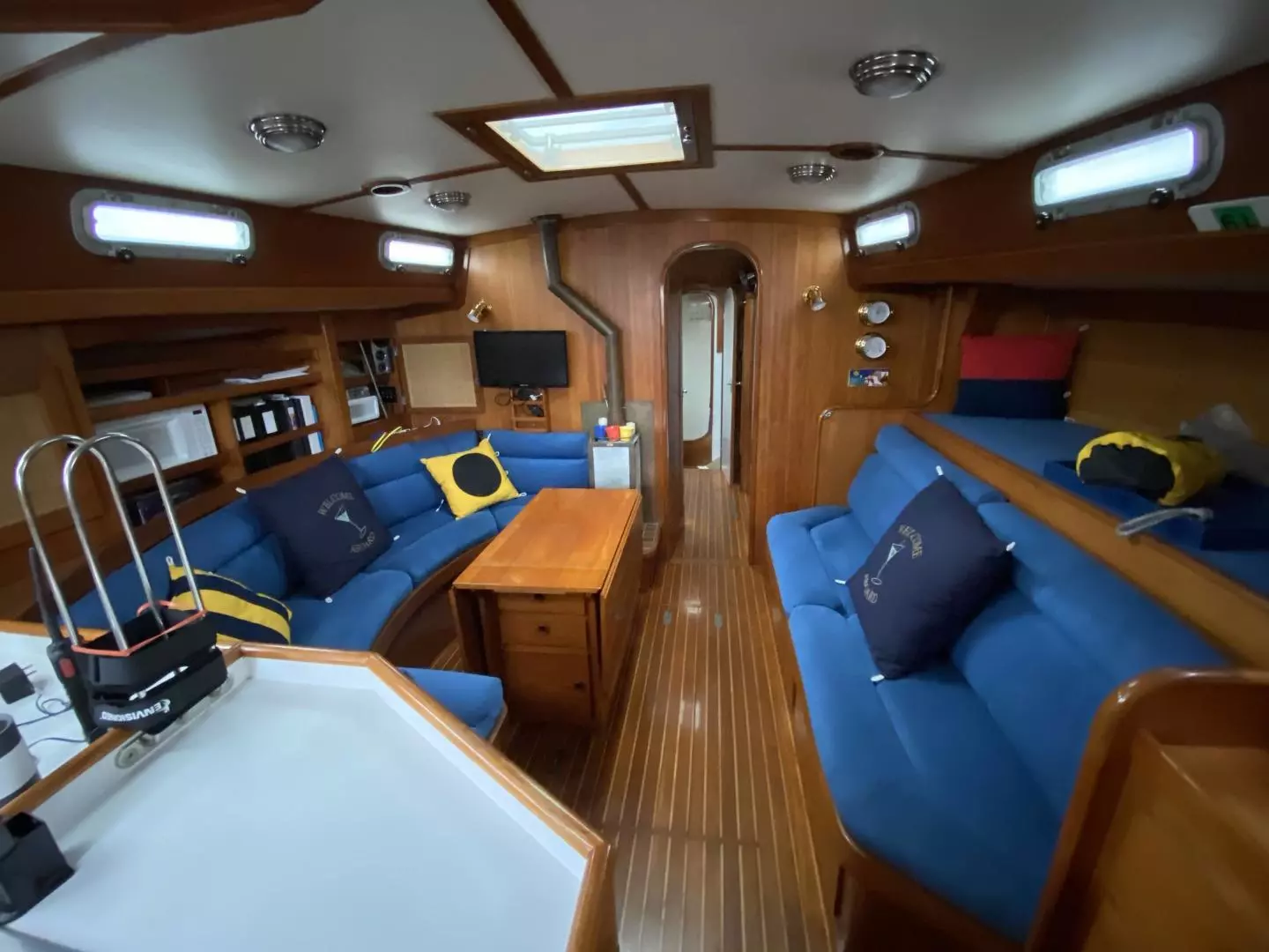 ELENA is easily sailed shorthanded, with furling headsails, electric furling mainsail, electric primary winches, and electronics including AIS and radar. An electric windlass and bow thruster round out the amenities for easy operation. Hydraulic centerboard allows for close-in coastal cruising or deep water performance sailing.