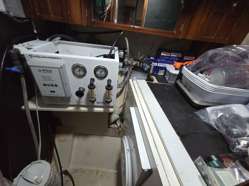 - Starboard Cabin: The former head has been converted into a work room, housing the genset, watermaker, and supplies parts.