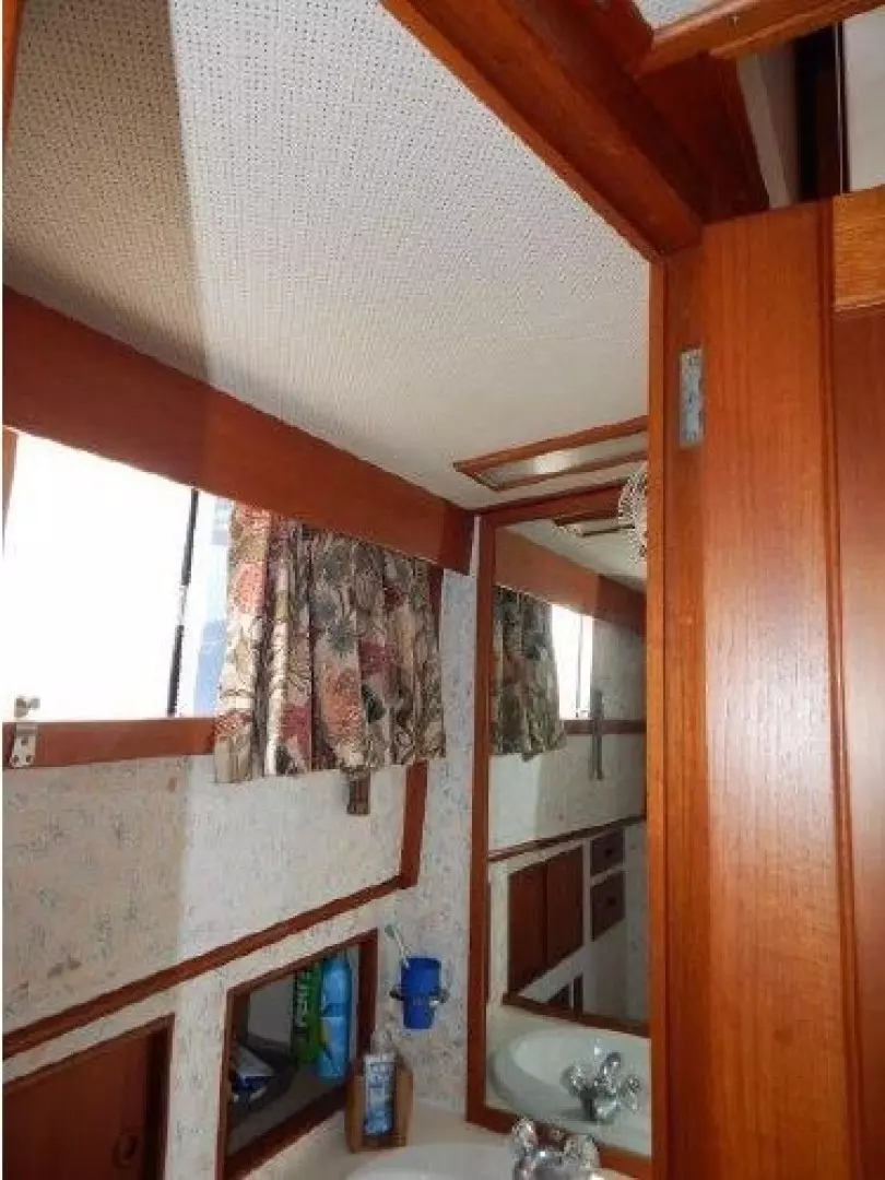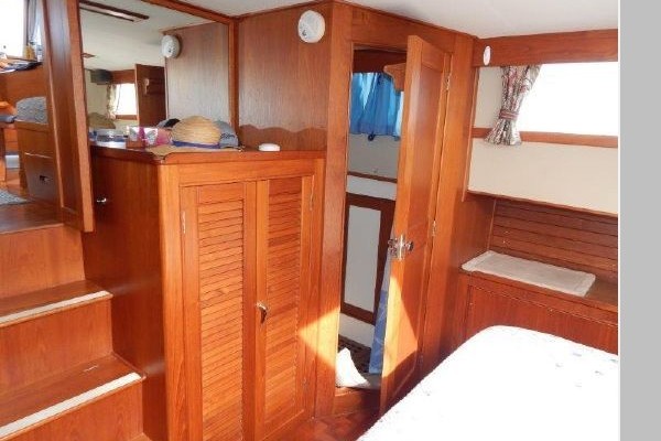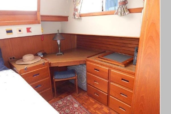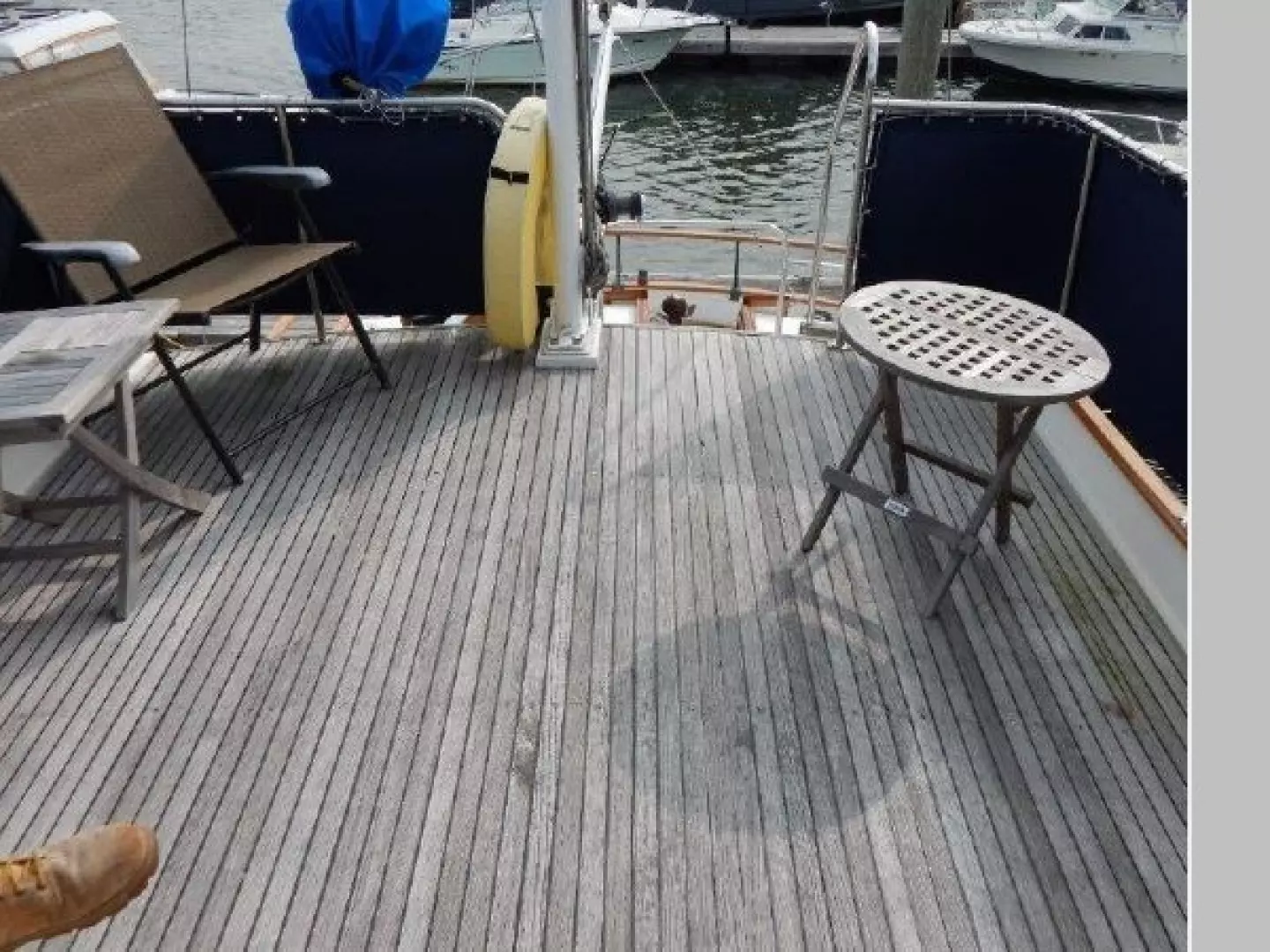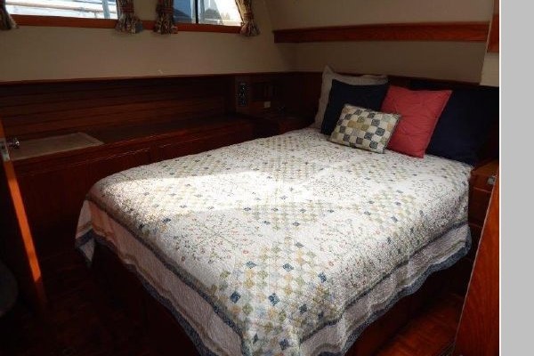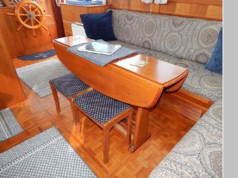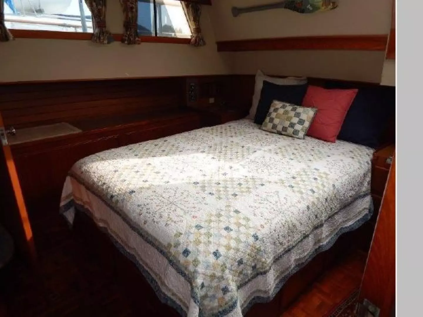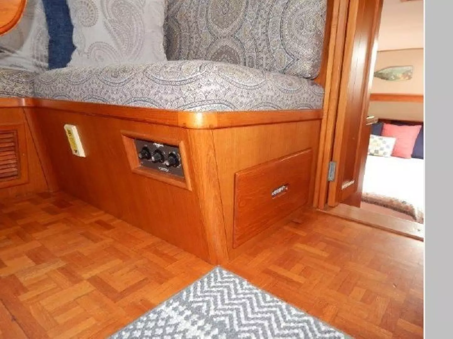 Linens and blankets convey with the boat. Satin-Varnished Teak Cabinetry and Teak Parquet Cabin Sole run throughout. New interior cushions in Salon. There are overhead lights, reading lights and opening windows with curtains in all three cabins. Tinted Windows allow privacy inside without glare. Excellent visibility, ventilation and comfort for Helmsman and guests in the Main Salon while underway or in port.