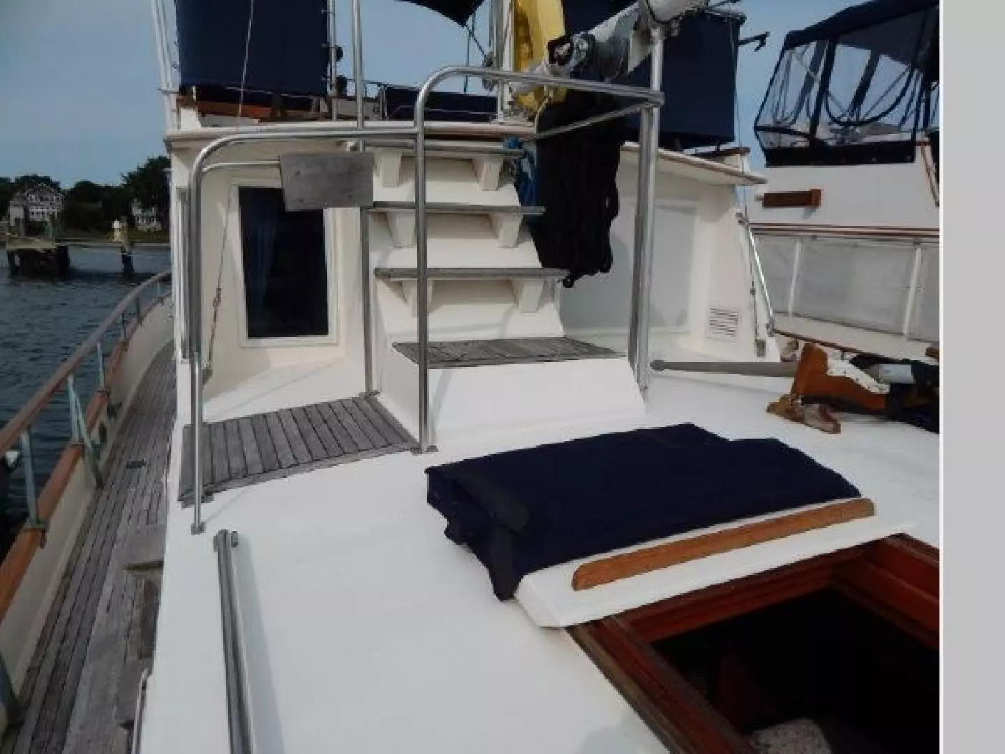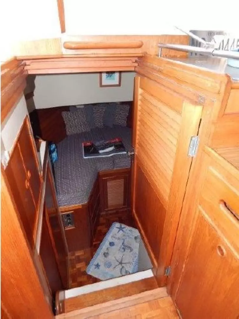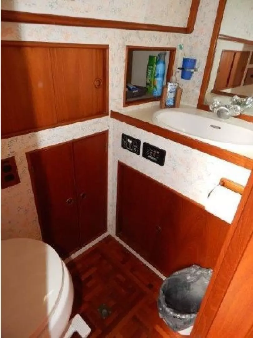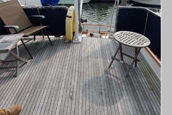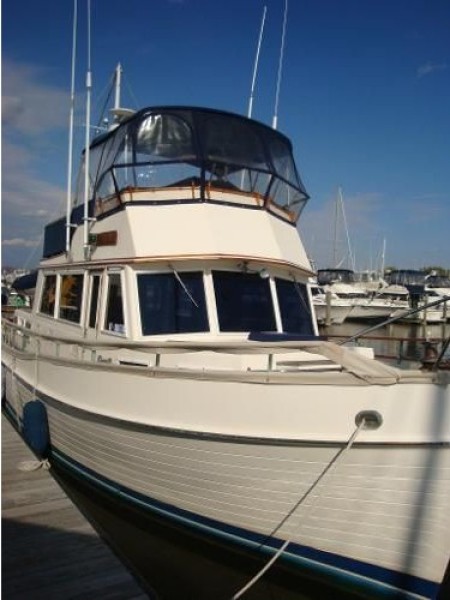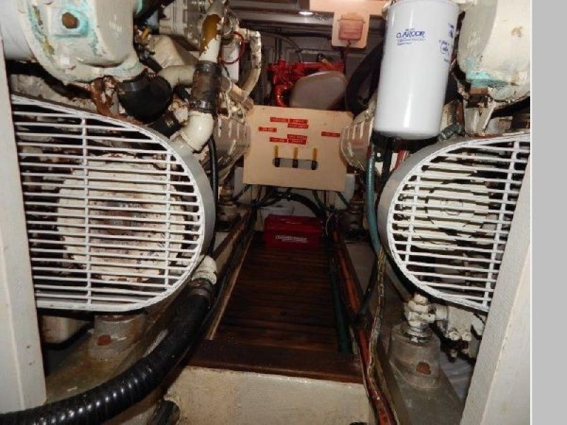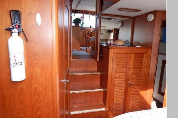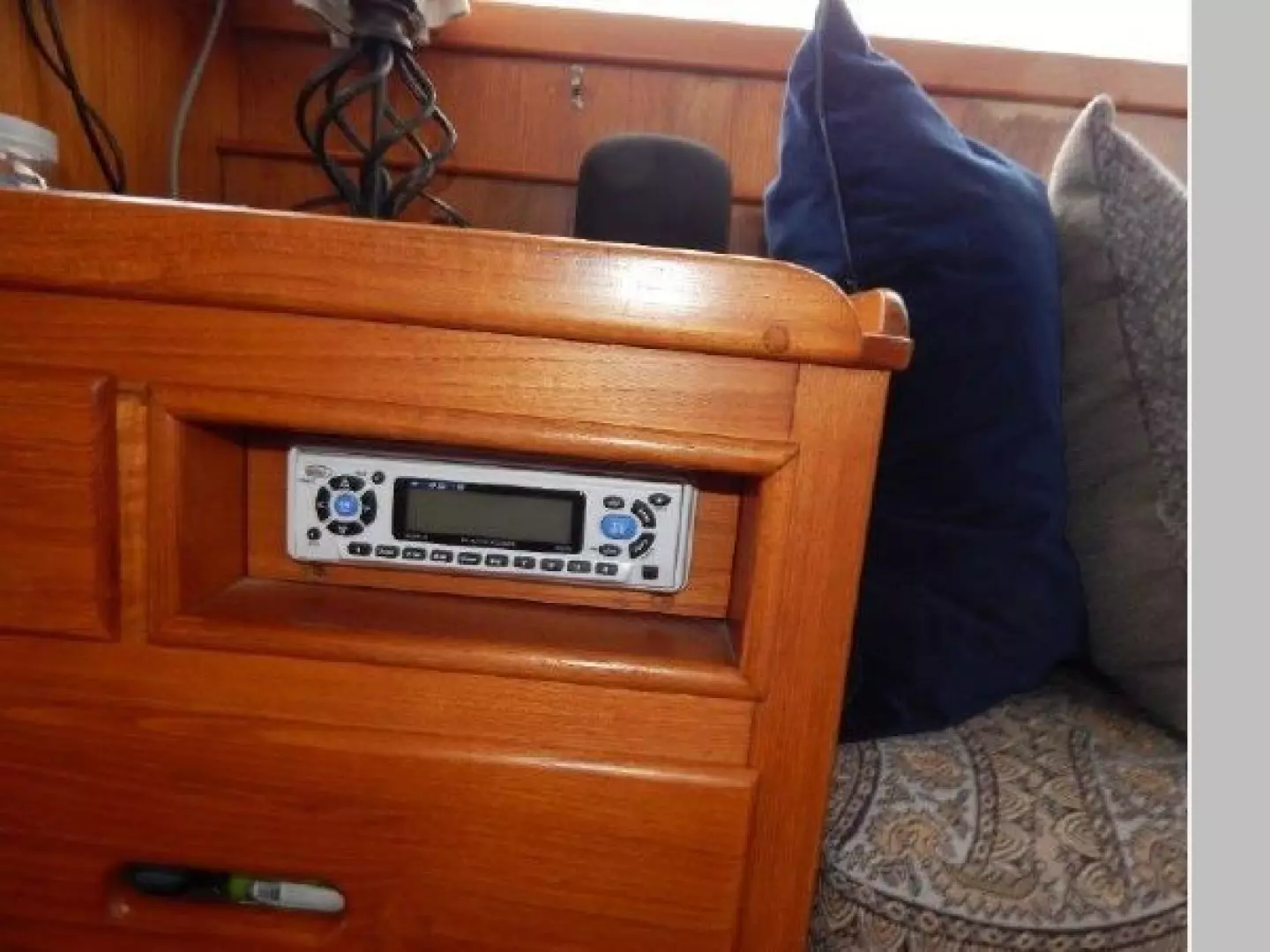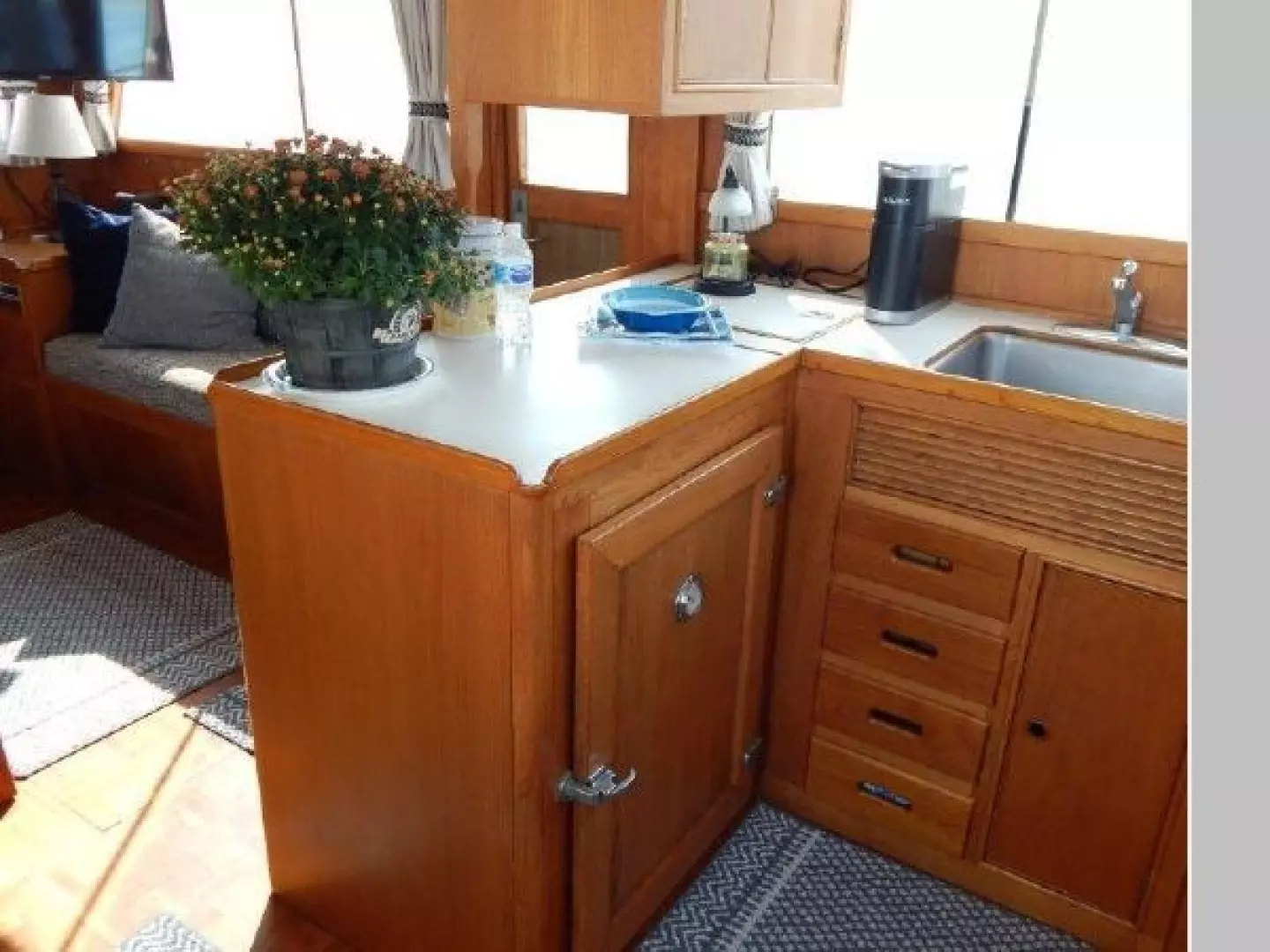 Linens and blankets convey with the boat. Satin-Varnished Teak Cabinetry and Teak Parquet Cabin Sole run throughout. New interior cushions in Salon. There are overhead lights, reading lights and opening windows with curtains in all three cabins. Tinted Windows allow privacy inside without glare. Excellent visibility, ventilation and comfort for Helmsman and guests in the Main Salon while underway or in port.