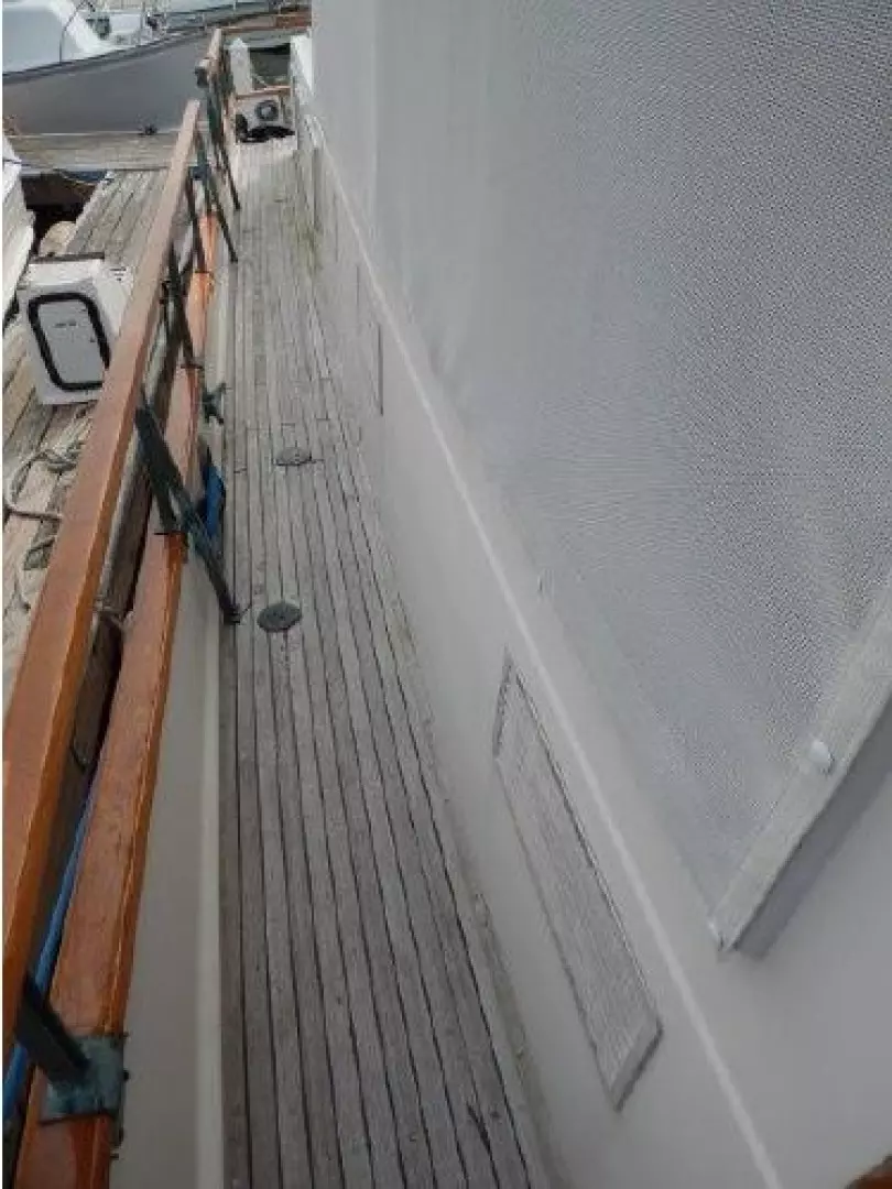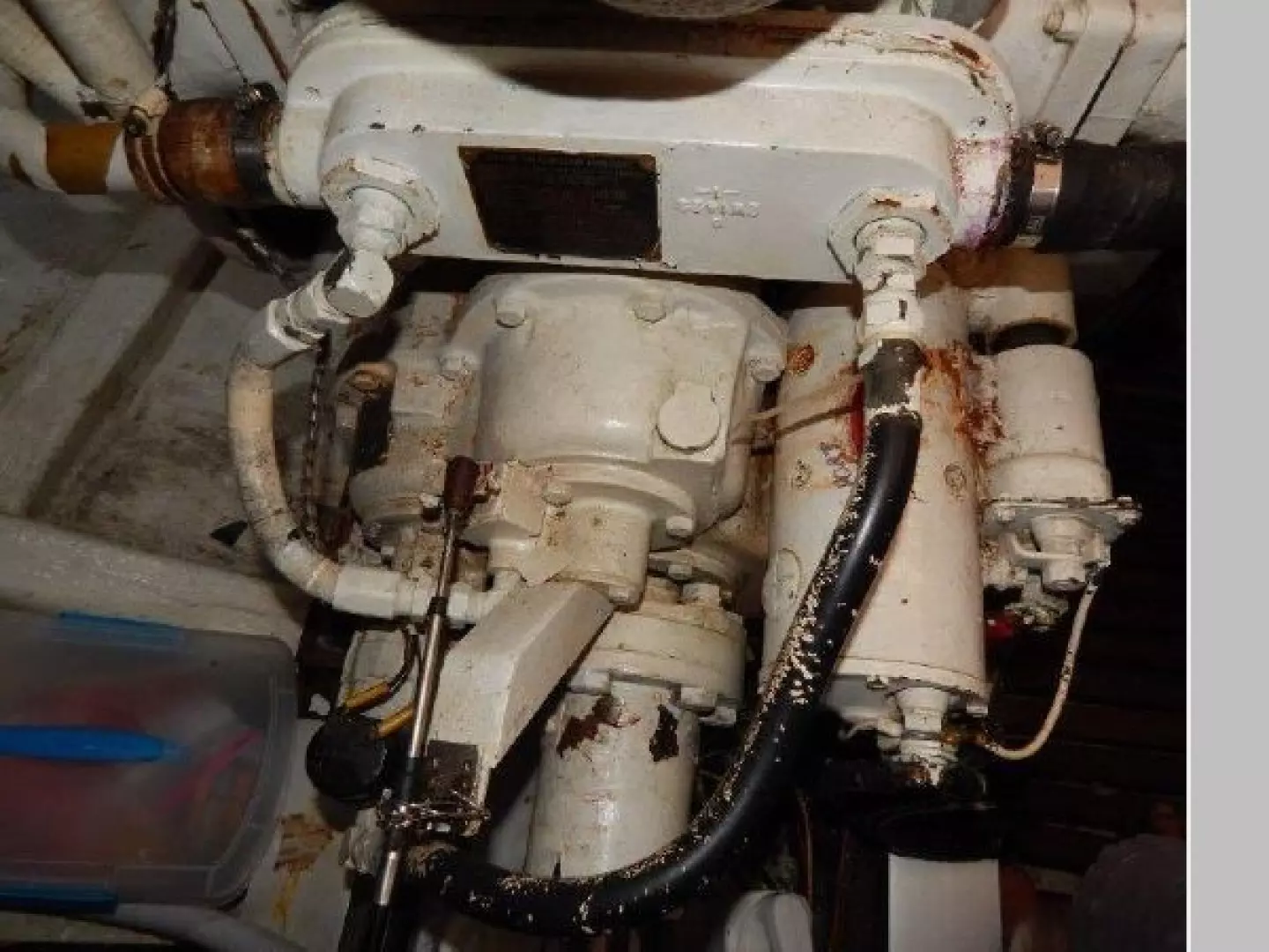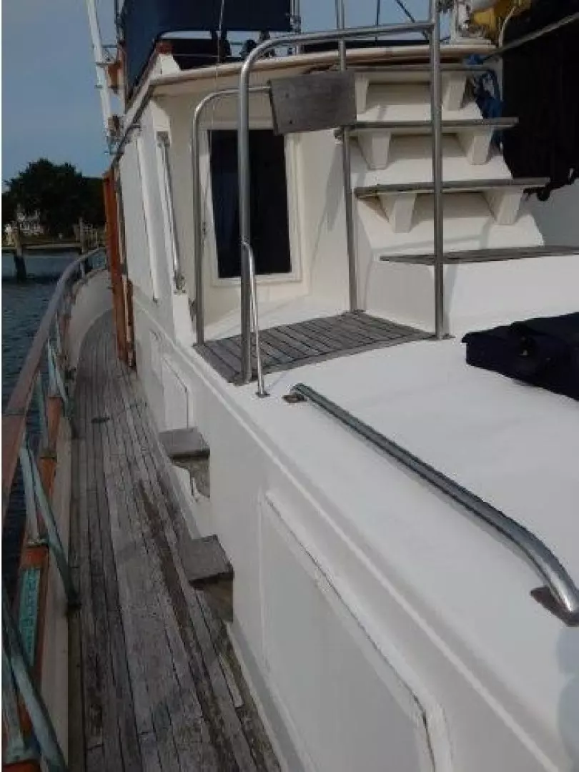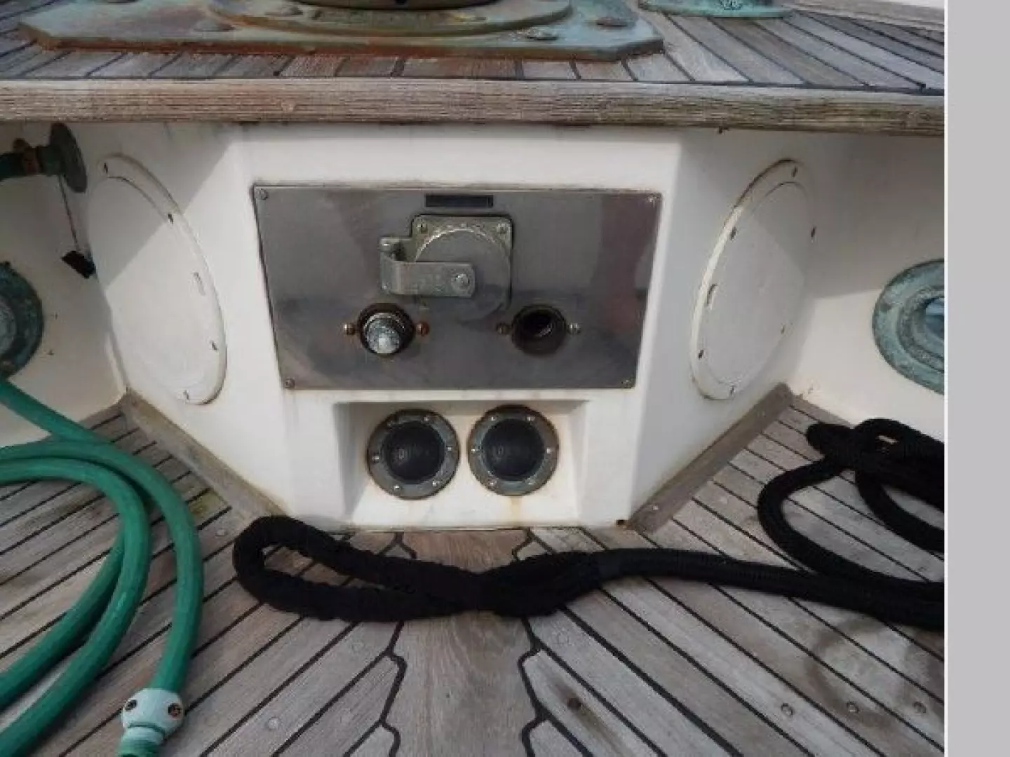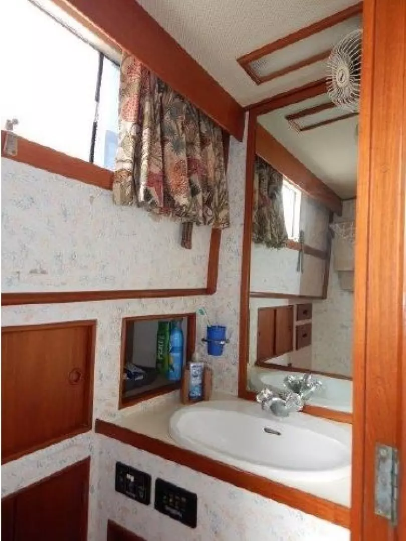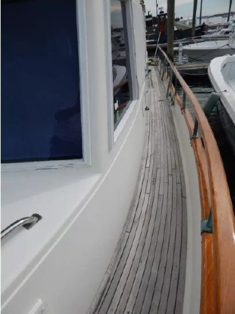 Linens and blankets convey with the boat. Satin-Varnished Teak Cabinetry and Teak Parquet Cabin Sole run throughout. New interior cushions in Salon. There are overhead lights, reading lights and opening windows with curtains in all three cabins. Tinted Windows allow privacy inside without glare. Excellent visibility, ventilation and comfort for Helmsman and guests in the Main Salon while underway or in port.