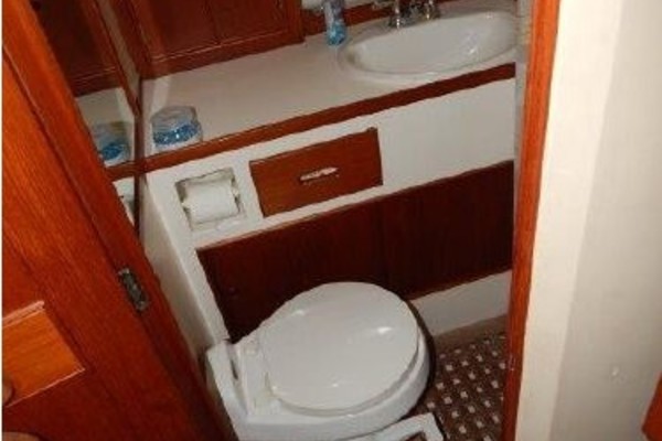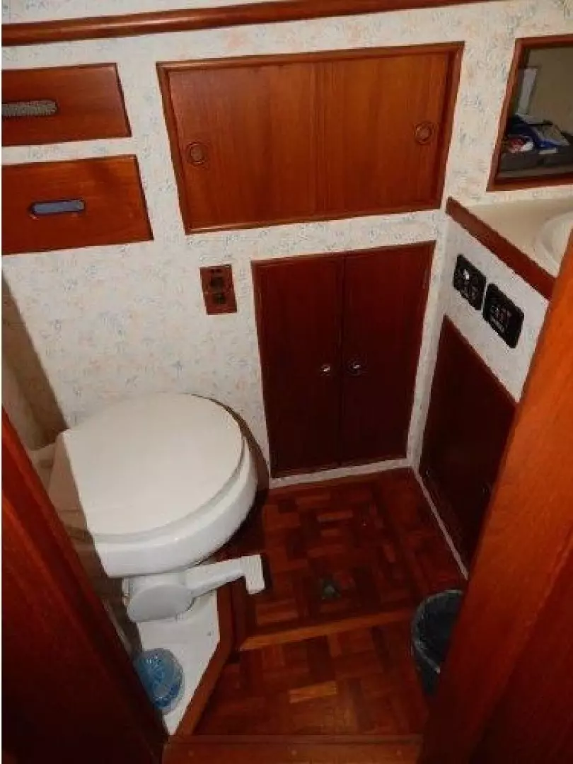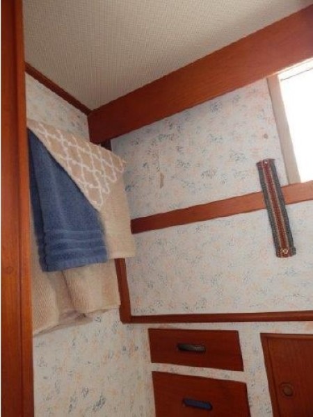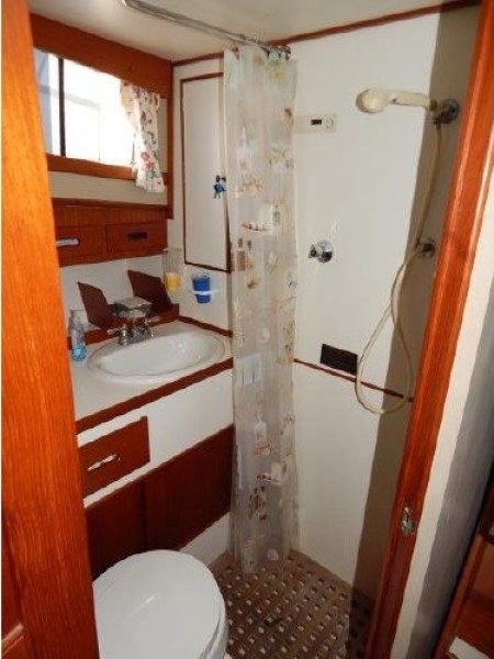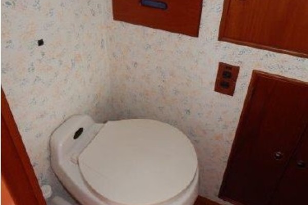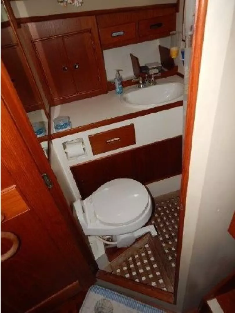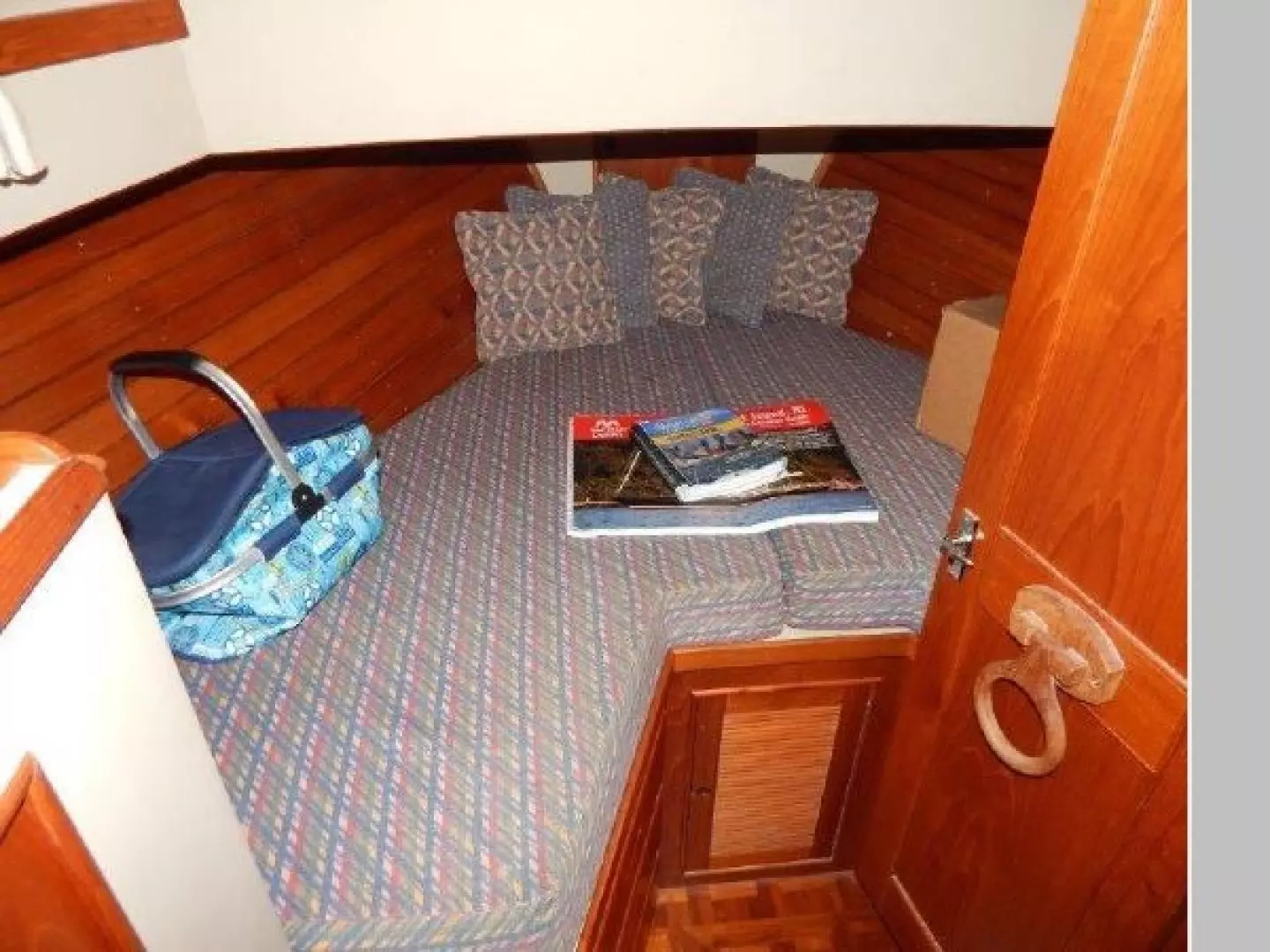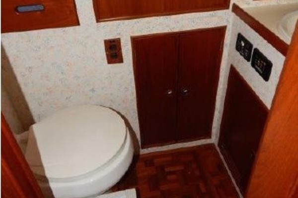 Sleeps a Total of 6. V-Berth Cabin is Forward with 6 drawers under the berth, a large Hanging Locker w/Louvre door, Chain Locker above and forward, and an enclosed Head with Shower, Vacuflush, Sink with counter top, Storage above and below the counter.