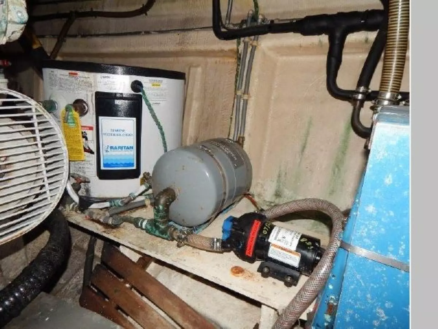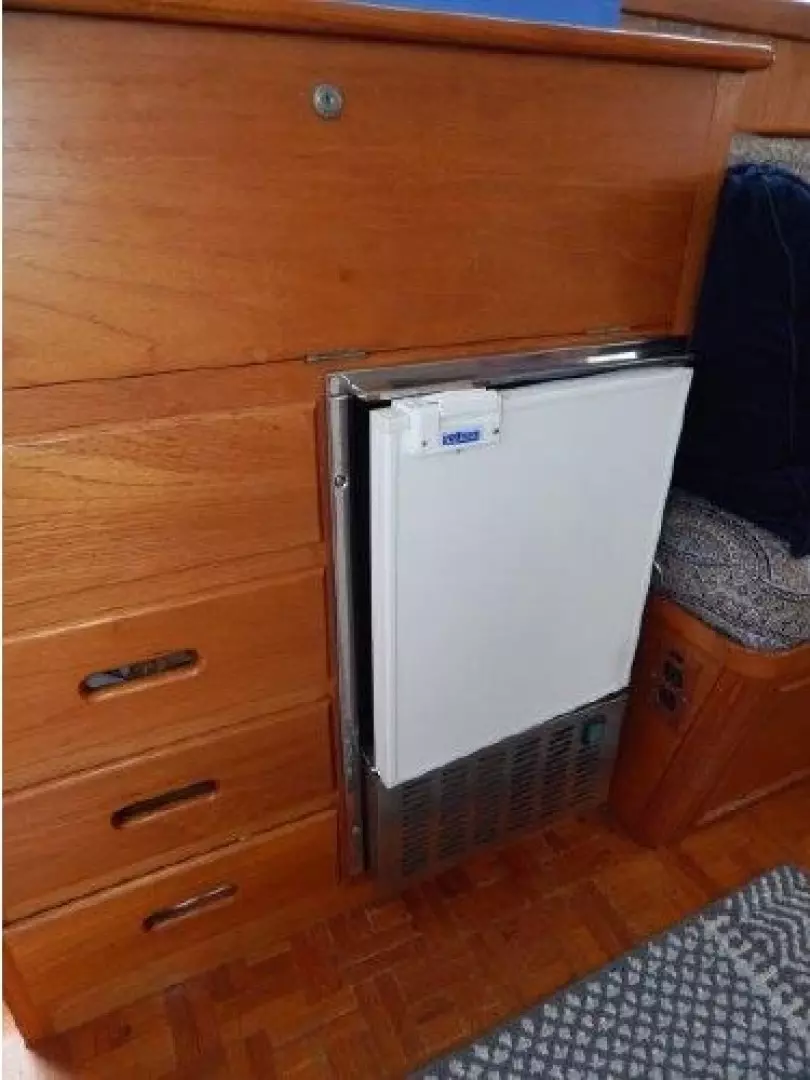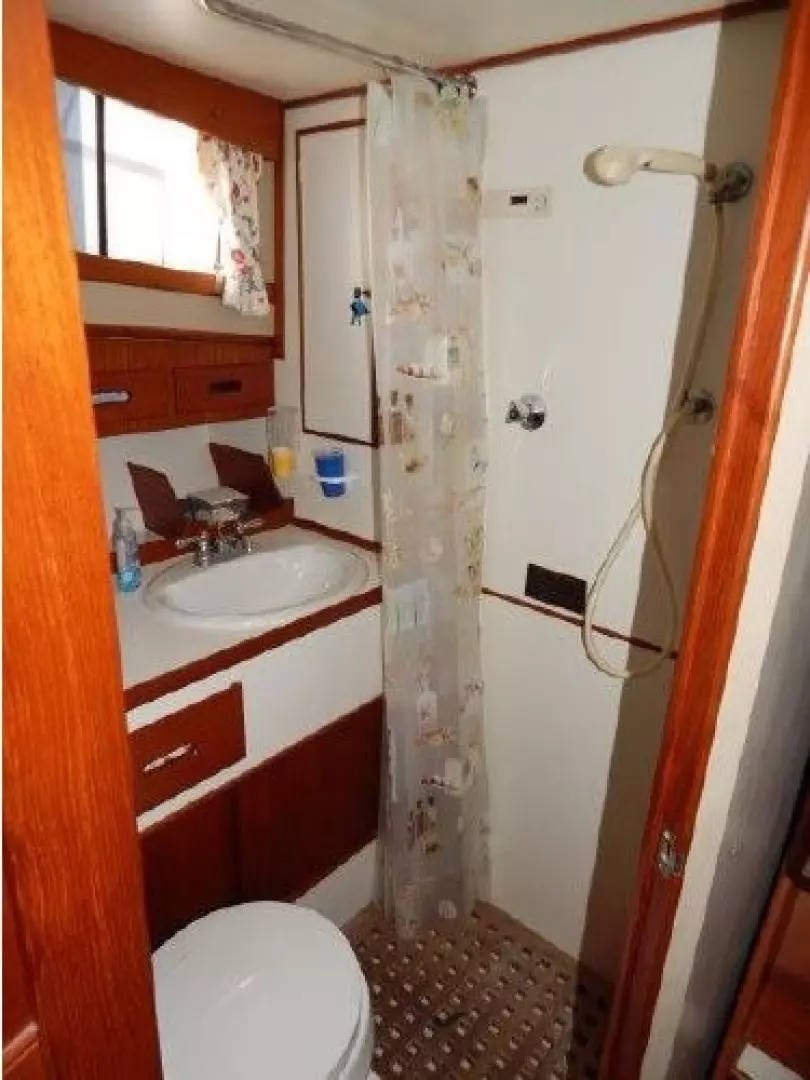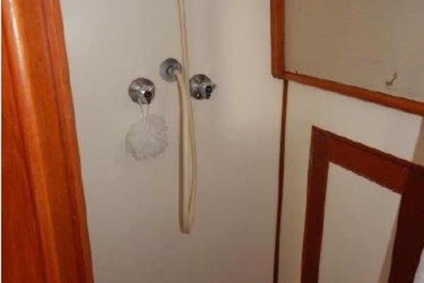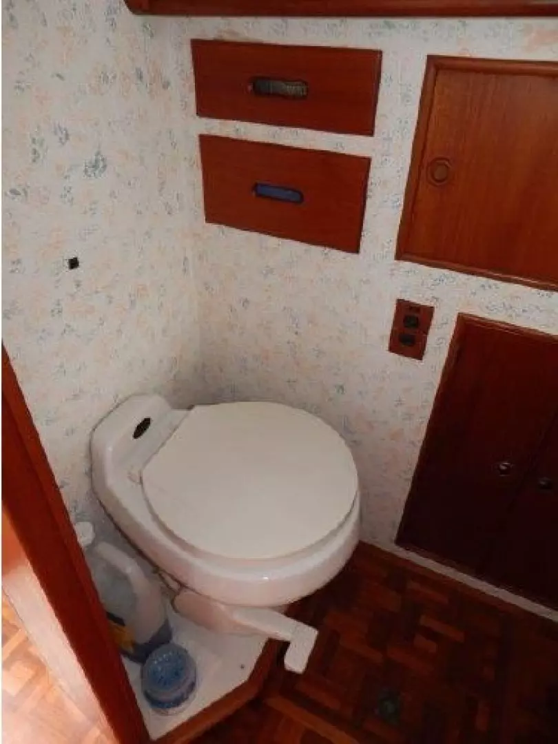 Sleeps a Total of 6. V-Berth Cabin is Forward with 6 drawers under the berth, a large Hanging Locker w/Louvre door, Chain Locker above and forward, and an enclosed Head with Shower, Vacuflush, Sink with counter top, Storage above and below the counter.