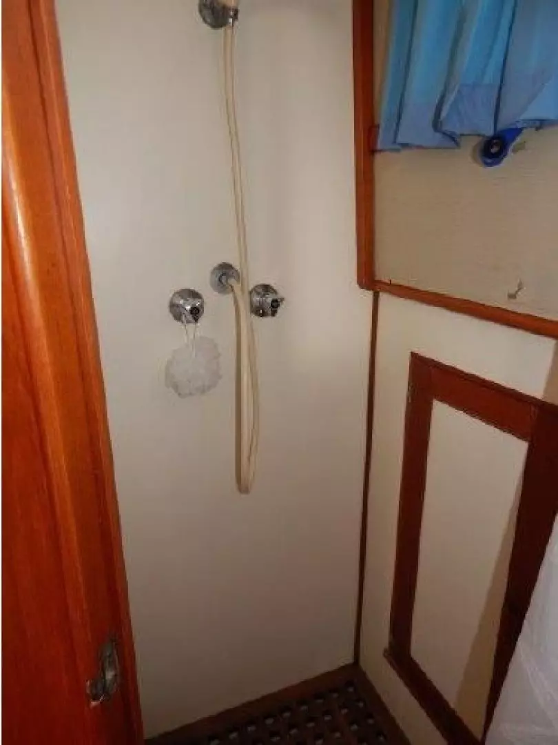 Down and aft 3 Steps (with storage underneath the steps) to the Master Stateroom with Double Teak Cabin Privacy Doors, Queen Centerline Berth (Custom Mattress) Numerous Drawers port and starboard, Teak Framed Mirror, an Enclosed Head w/Vanity, Drawer storage & Vacuflush Head to Port and a separate enclosed Shower w/Teak Grating to starboard. There are Reading Lights, Overhead Lights, Sliding Windows w/Curtains and an aft hatch door w/screening leads up to the aft deck.