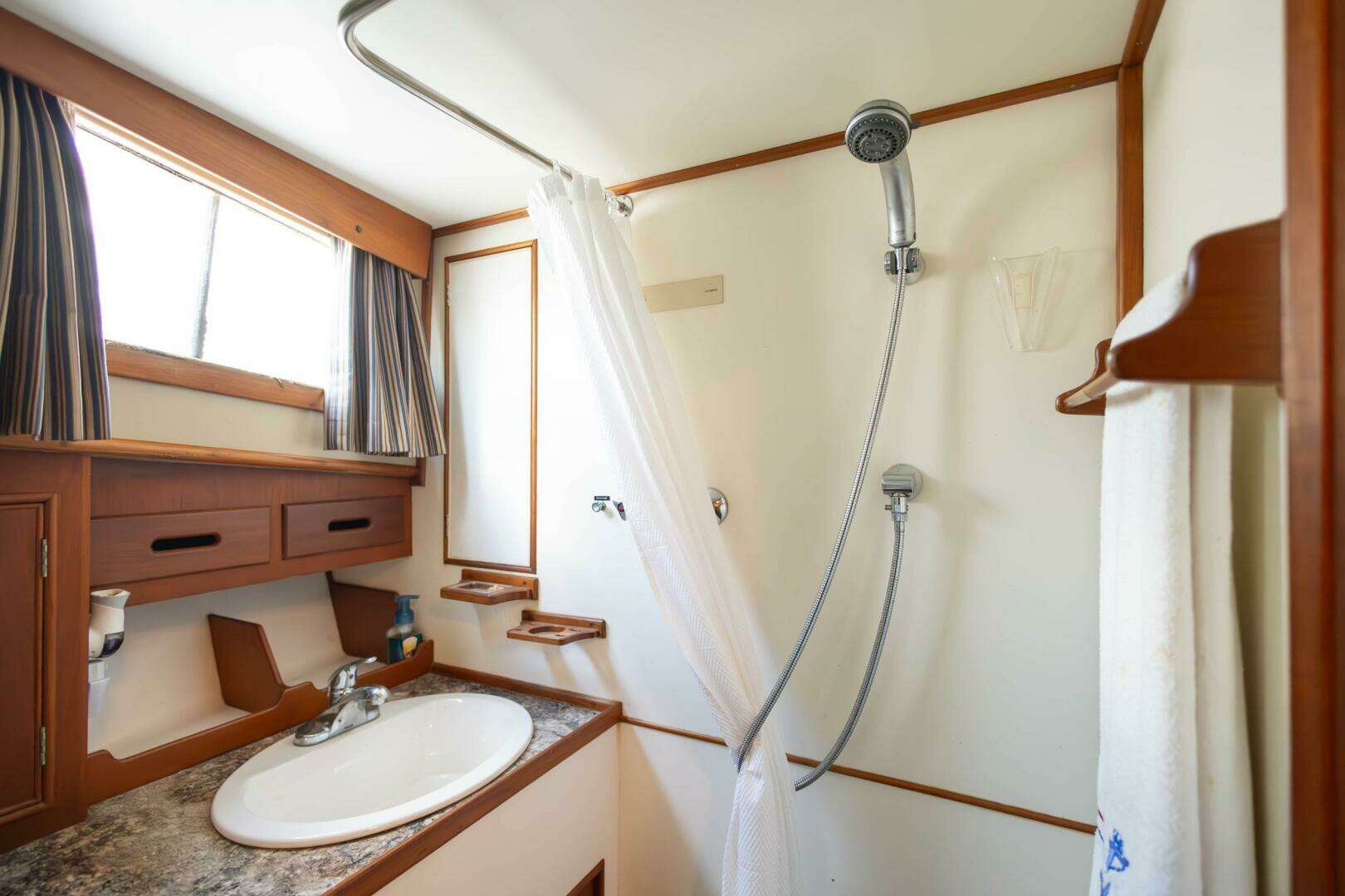 - Guest Stateroom: V-berth forward, with adjacent head and shower.