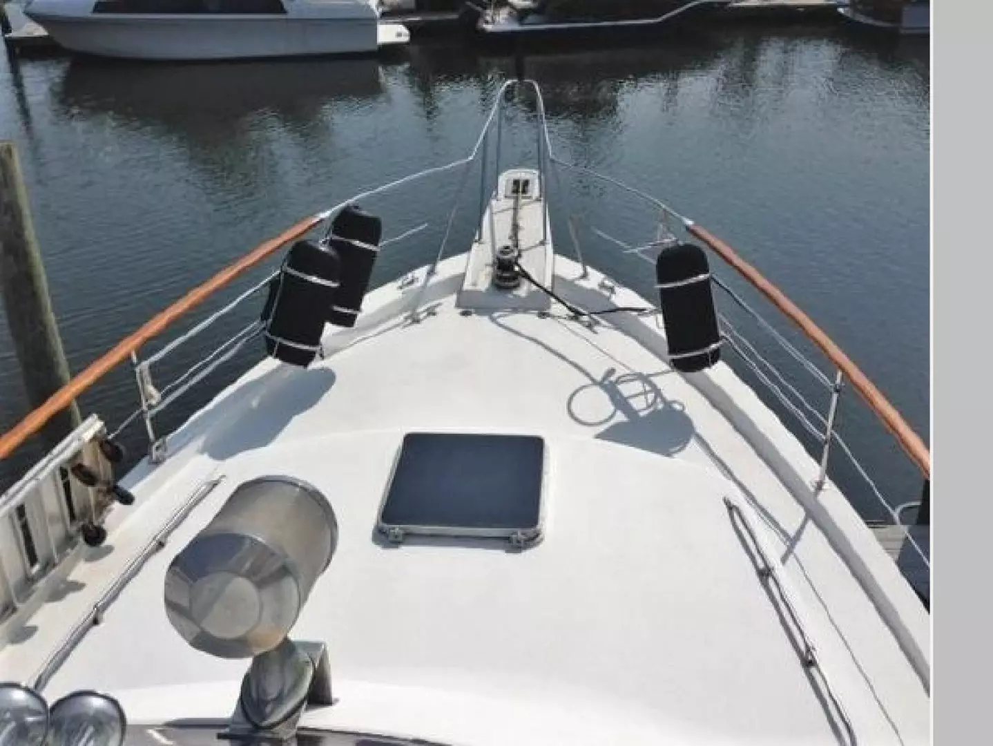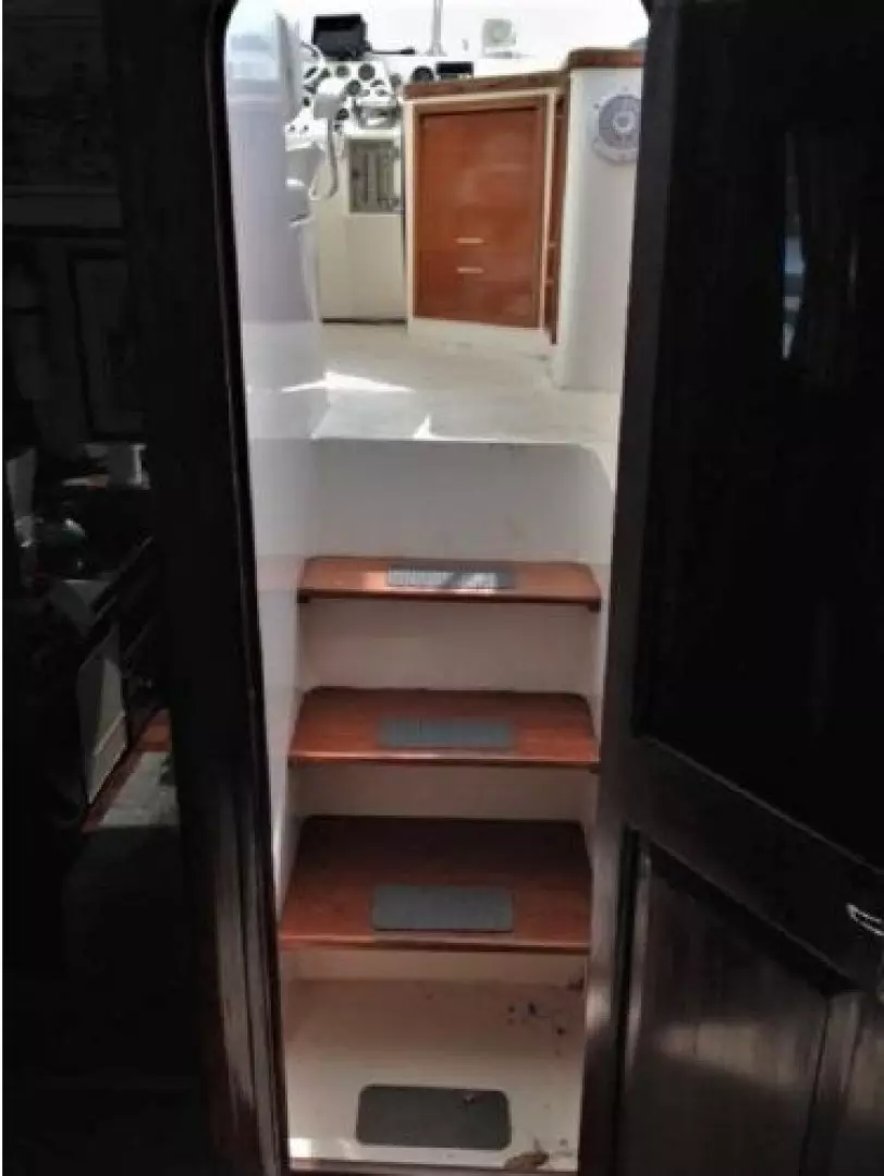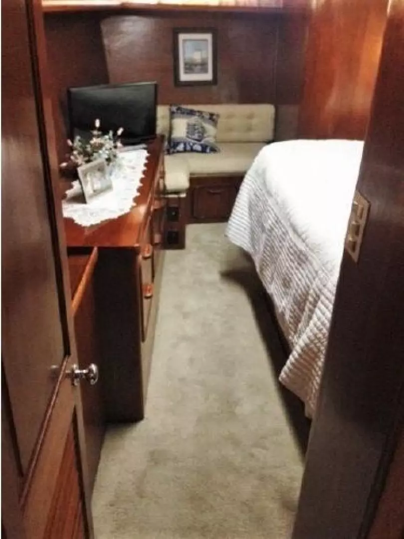 The unique Interior layout configuration provides surprising spaciousness. There is a large aft stateroom, an amidship office with daybed and an additional stateroom forward. There are two full head compartments with stall showers.There is a large open galley with dinette and a very comfortable large salon.