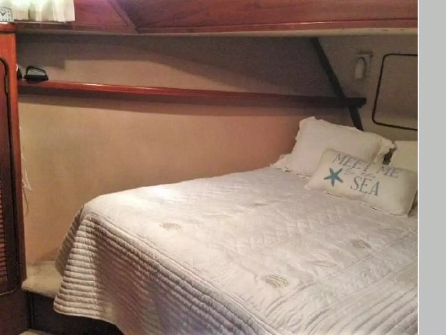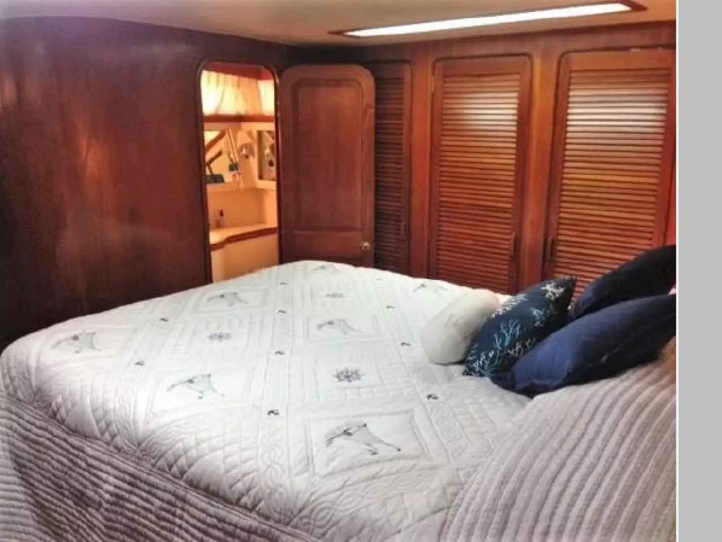 The master stateroom is further aft with a center, queen sized berth, starboard side dresser, book shelves, 3 large closets to port and a 20" TV..