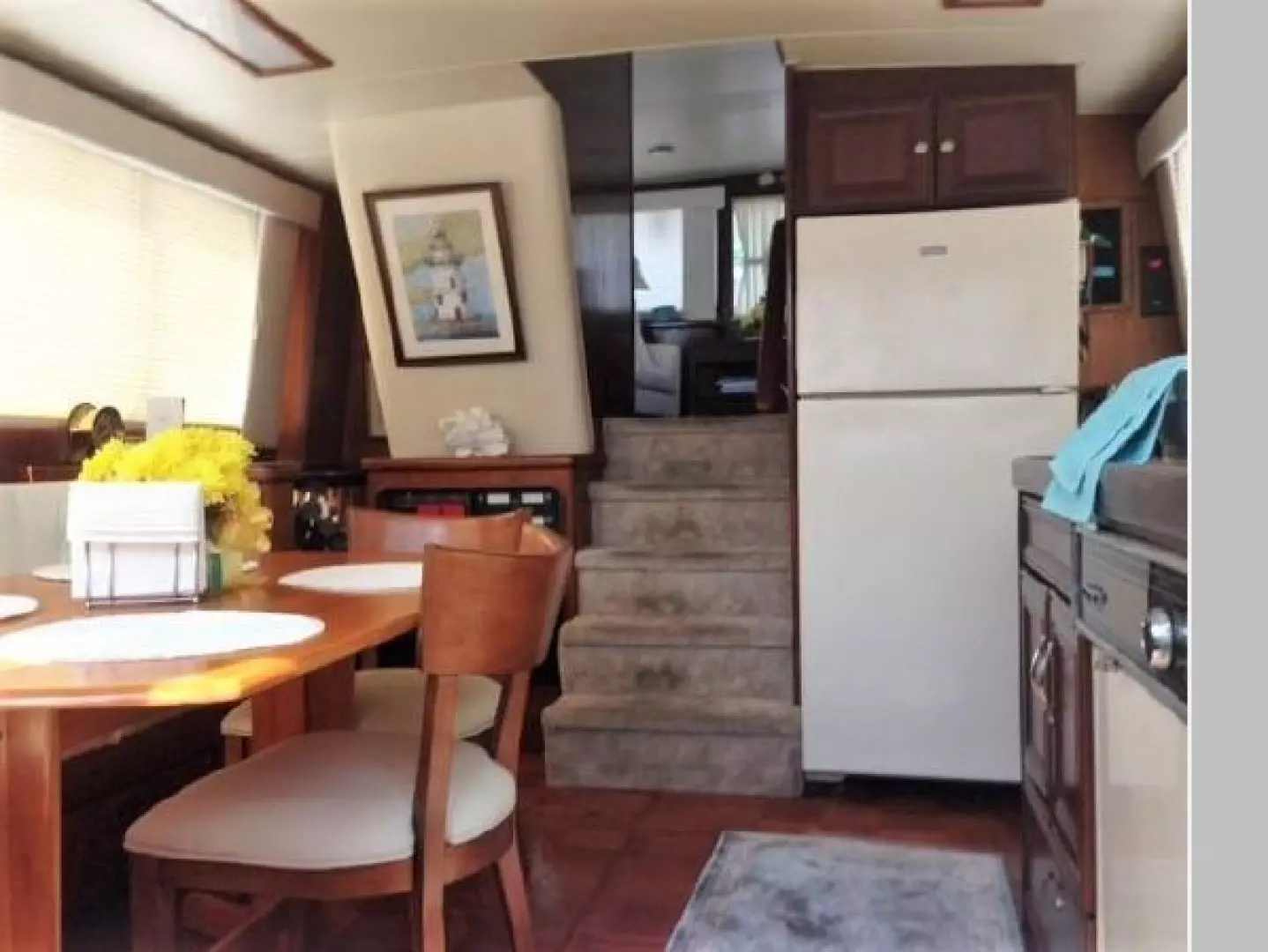 The galley is forward down to port and has an LG microwave, a 4 burner electric stove, a Hotpoint refrigerator freezer, porcelain sink, a Maytag dishwasher and abundant drawers and cabinets. The large u-shaped dinette has a wooden table and two additional wooden chairs. This area has great views out the side windows and large windshield.