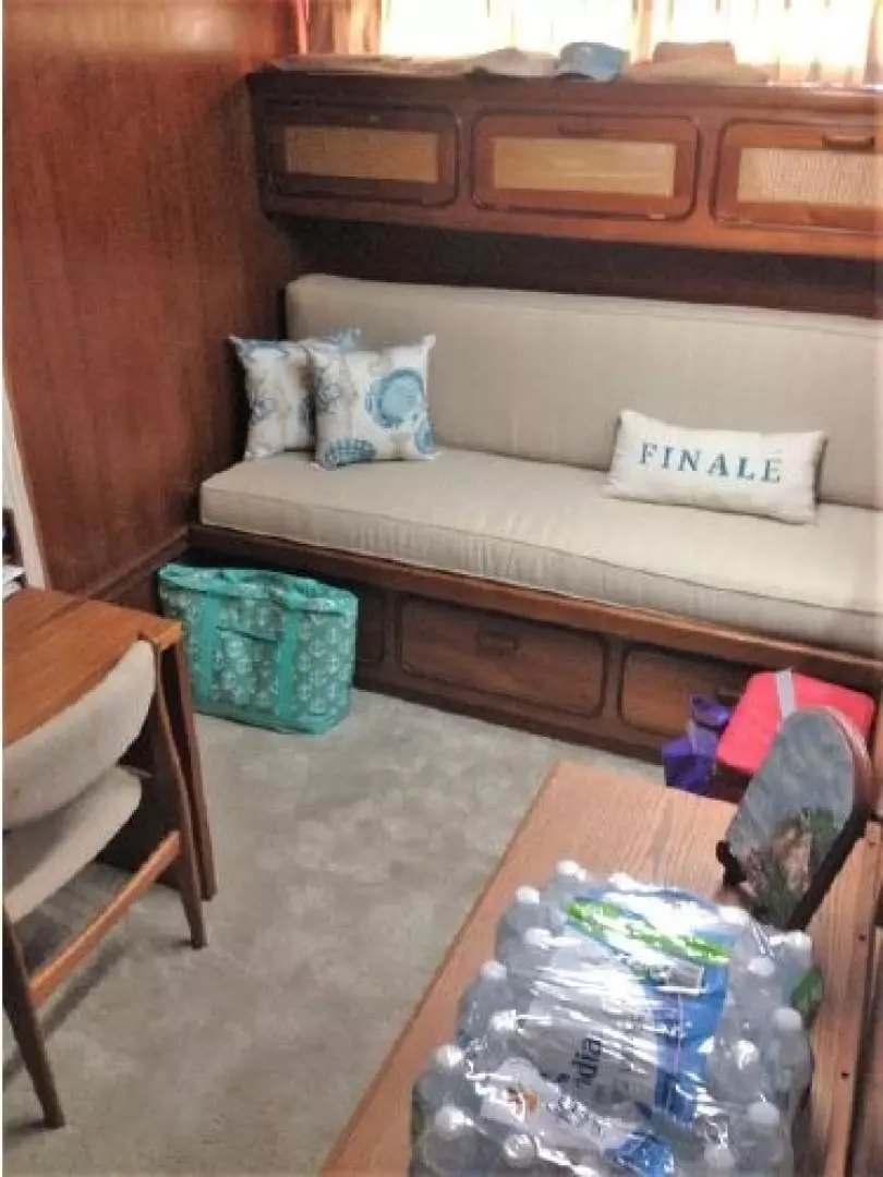 The main salon has aft doors leading out to the aft deck and two doors forward leading out to both the port and starboard side decks. There is a large couch and 2 swivel rockers, a coffee table and 2 end tables. There is a corner entertainment center topped with a 39" TV. An icemaker and bar are located at the forward end of the salon.