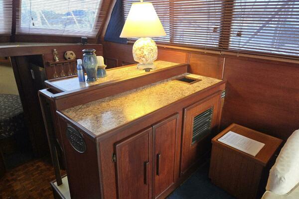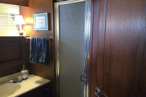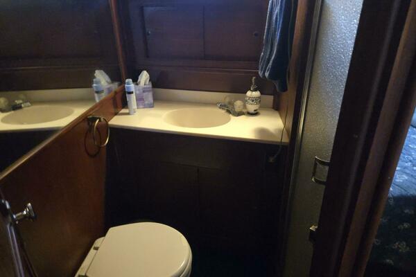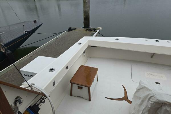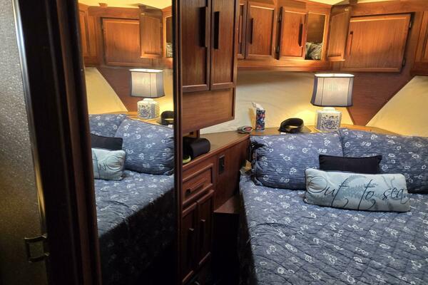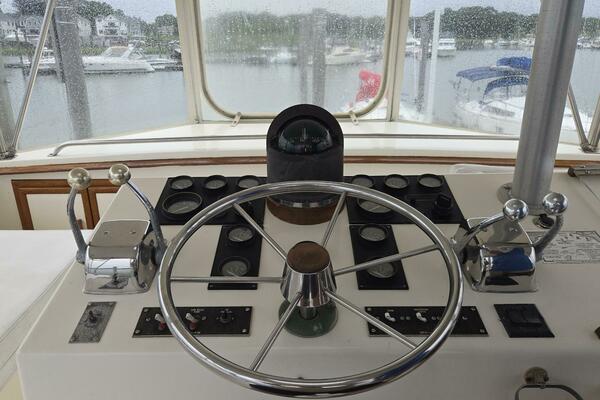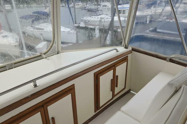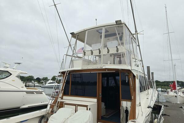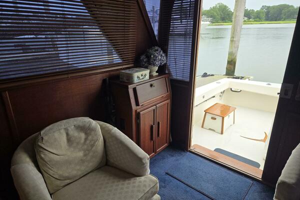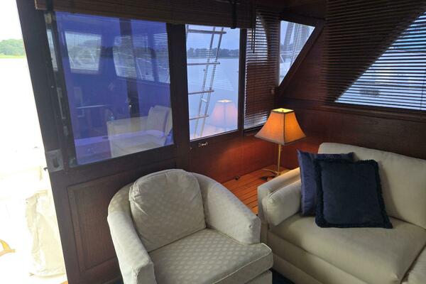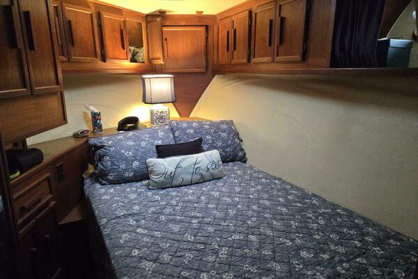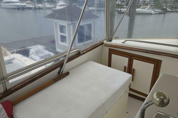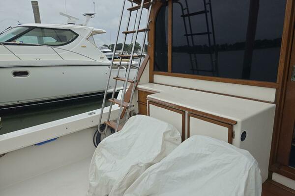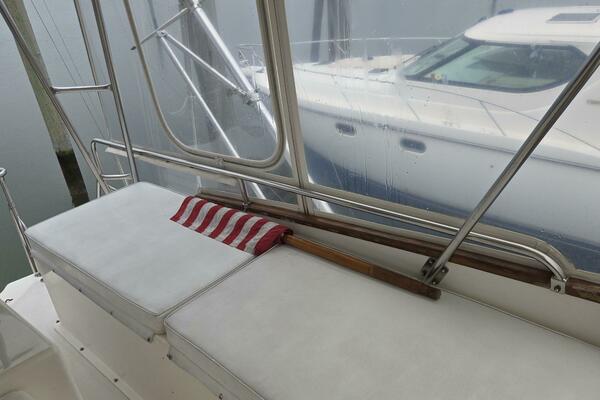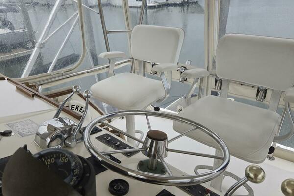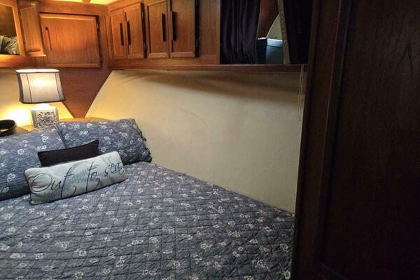 Forward you have the master stateroom with a offset queen bed, hanging locker and ventilation hatch. Ample storage throughout. Aft to port is the enclosed head with separate stall shower.. Aft to port again is the dinette area that converts to another queen bed. Aft to starboard is the spacious galley area with all the amenities including a garbage disposal. Up a couple of steps to the salon area with a sofa to port, 2- Barrell Chairs. Out the salon door the a large cockpit area suitable for deep sea fishing or entertaining. Up on the flybridge you have a center helm with a forward facing bench seat and a bench seat on the port side. Very roomy flybridge with ample storage in cabinets and under seats.