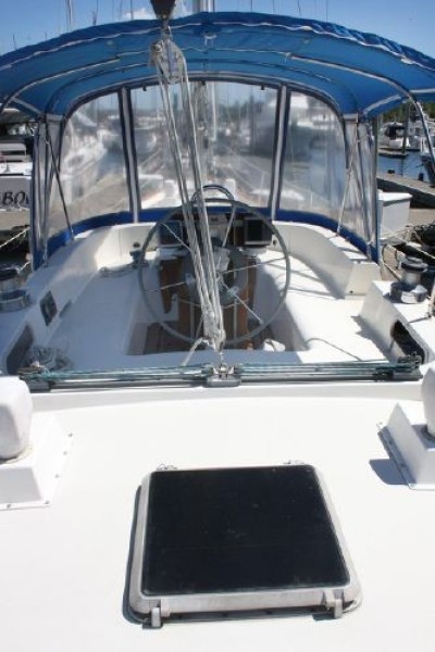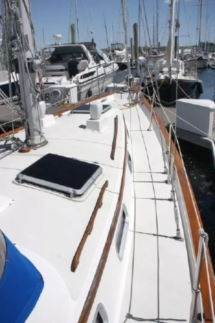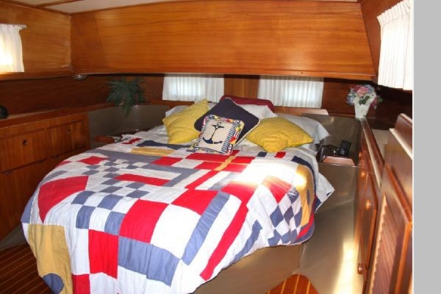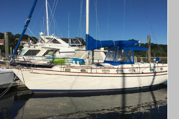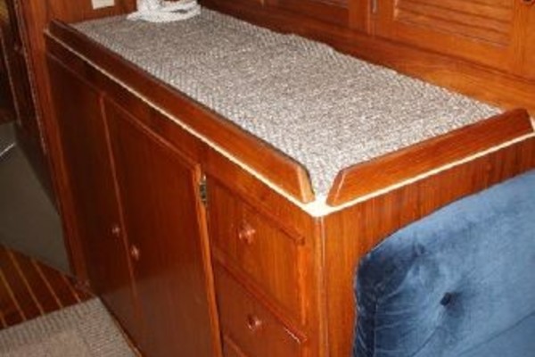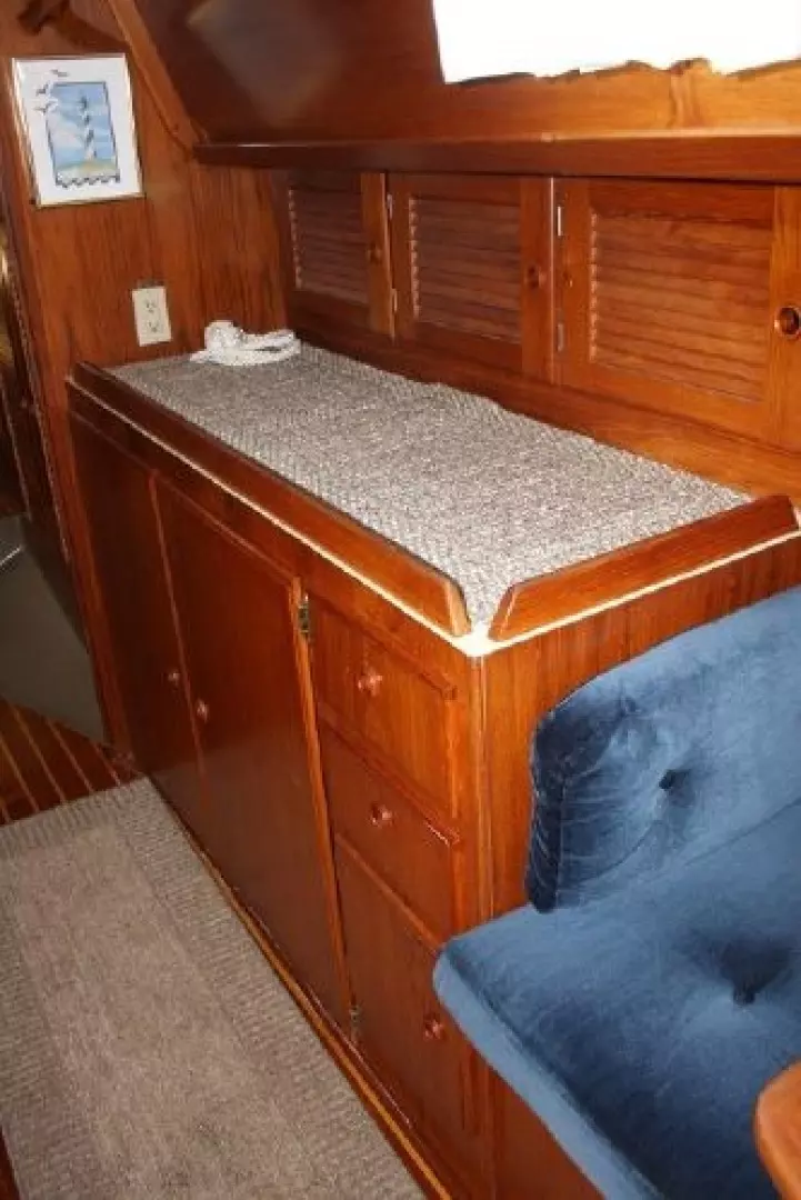 The interior is very attractive with varnished teak bulkheads and trim throughout; a varnished teak and holly sole; and, light-colored soft headliner overhead and under the side decks. The forward guest cabin features a large, full-width queen-sized berth with light beige upholstery and drawers under; a full-length hanging locker to port; a bureau/locker to starboard; a private head with shower (accessible from forward cabin and main salon); an overhead hatch and four opening ports; and, a fore peak locker. Moving aft, the salon has settees (66 long, doubling as berths, Navy upholstery) to port and starboard with backrests and bookshelves outboard as well as storage behind the seat backs. A solid teak drop-leaf table is mounted on centerline and offers ample room for six adults. A Force 10 propane cabin heater is mounted on the mast. Ventilation is excellent with two large hatches over the dining area and opening ports throughout the salon, galley and aft head. The U-shaped galley is to starboard and includes a Hillerange three-burner propane stove with oven; a microwave oven; Adler-Barbour refrigeration/freezer; deep, double stainless steel sinks with hot and cold pressure water; a salt water foot pump; and, commodious storage in lockers and drawers (including designated dish bins outboard.) To port is the forward facing navigation station complete with shelves, navigators seat, storage under the chart desk and ample space for electronics. Aft of the nav. station is the passageway (offering full, standing headroom) to the owners stateroom aft. Outboard in the passageway is a large locker with louvered doors and generous storage compartments. The engine compartment is large and well lighted and is easily accessible from the owners cabin. The spacious and airy aft cabin has a walk-around queen-sized berth (66 x 42) with beige upholstery on centerline; bureaus with drawers and wide shelves outboard to port and starboard; a large hanging locker; and, four opening ports plus overhead hatch for ventilation.