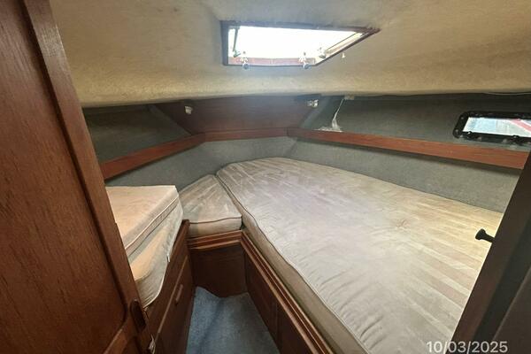 The stateroom forward offers a double size berth that converts into a queen size berth with an insert, shelves, storage drawers, hanging locker, rod storage, overhead hatch, 2 portlights, reading lights, window with blinds to the salon and a privacy door.