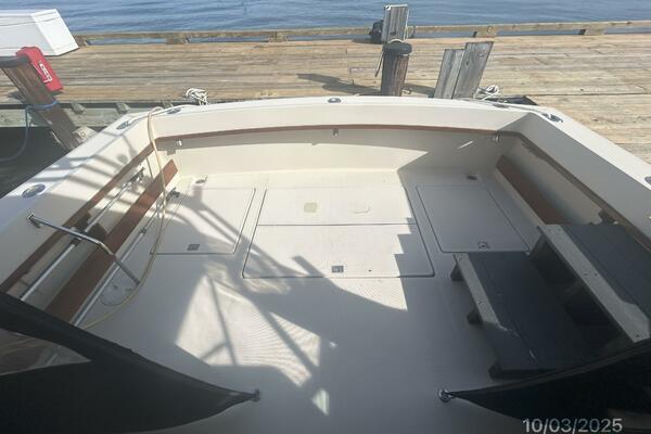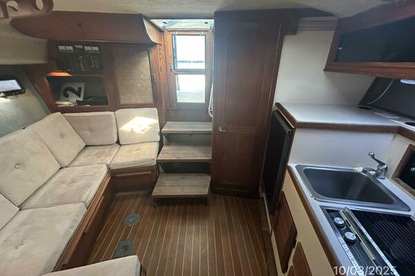 From the large cockpit, you walk forward into the upper deck and find a benchseat with storage on each side, helm starboard forward and engine room access. Continue forward and step down the companionway into the salon to find the head port aft, galley to port and wrap-around seating with storage and a removable table to starboard. Walk forward to the stateroom with a double size berth that converts into a queen size berth with an insert.