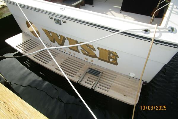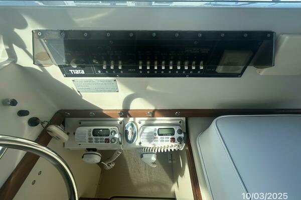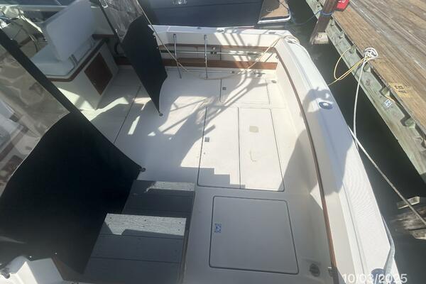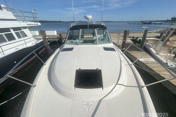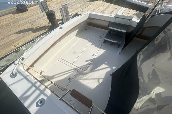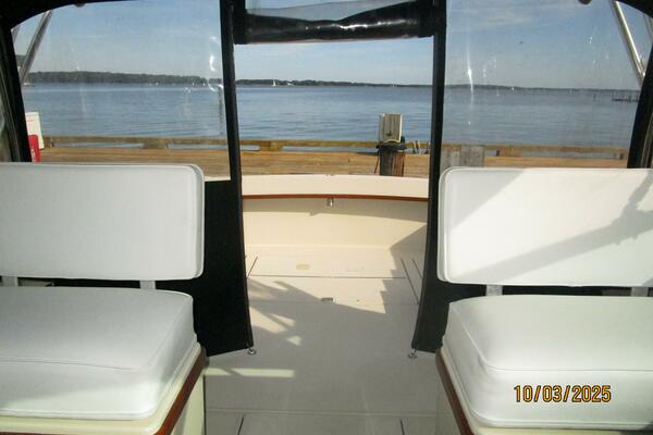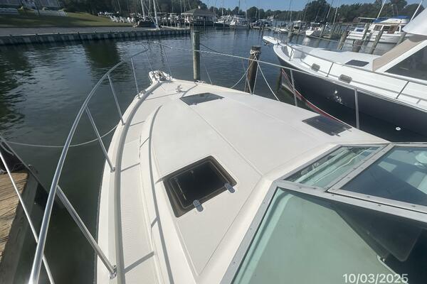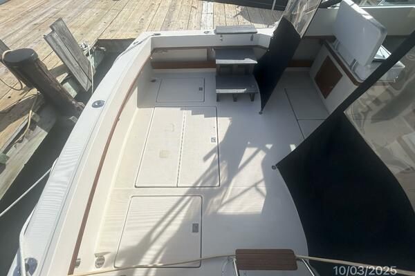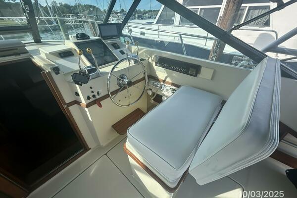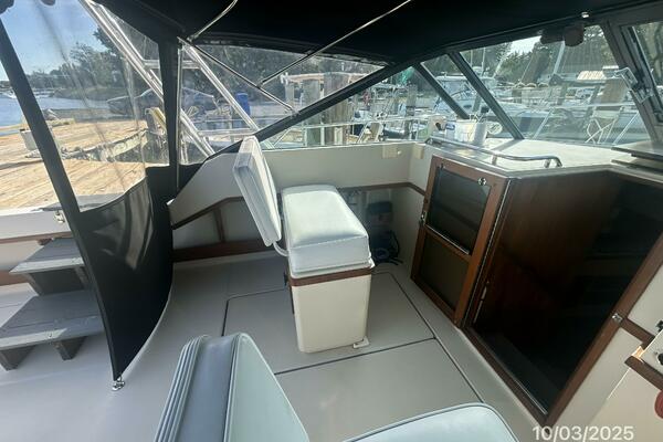 The upper deck offers a benchseat with storage on each side, non-skid deck, shelves, helm starboard forward, anchor windlass control, searchlight control, trim tabs controls, engine controls, opening center windshield, Marinco wipers, aluminum Radar arch, bimini on an aluminum frame and Eisenglass enclosure.