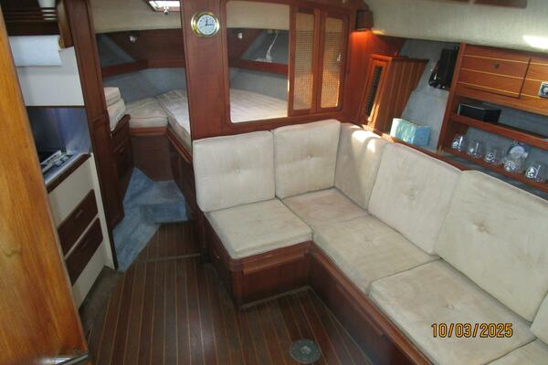 The salon offers a teak & holly sole, 2 overhead hatches, 3 portlights, wrap-around seating with storage and a removable table that converts into a double size berth, a window with blinds to the stateroom, shelves, cabinets and rod storage.