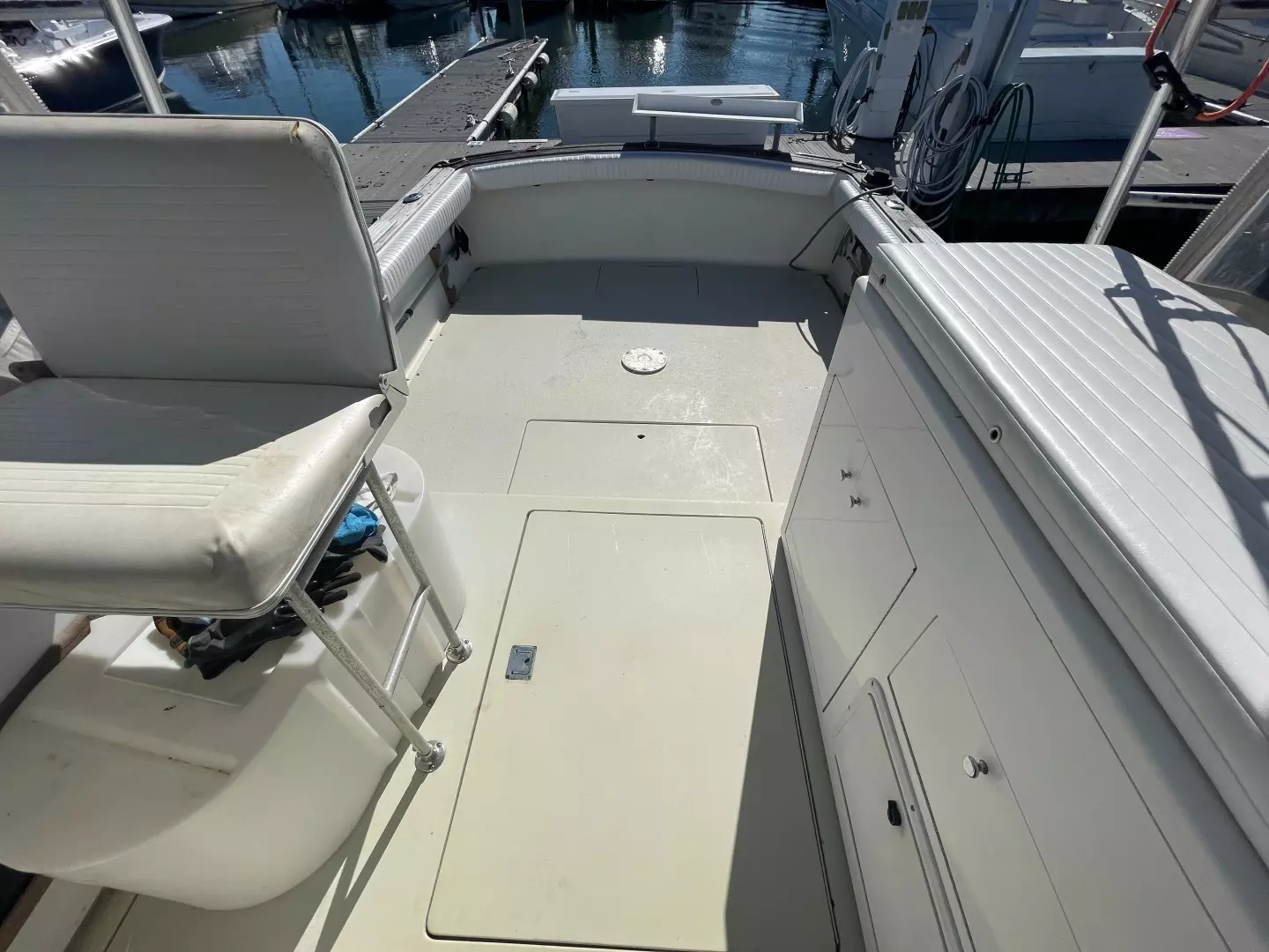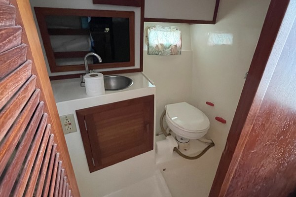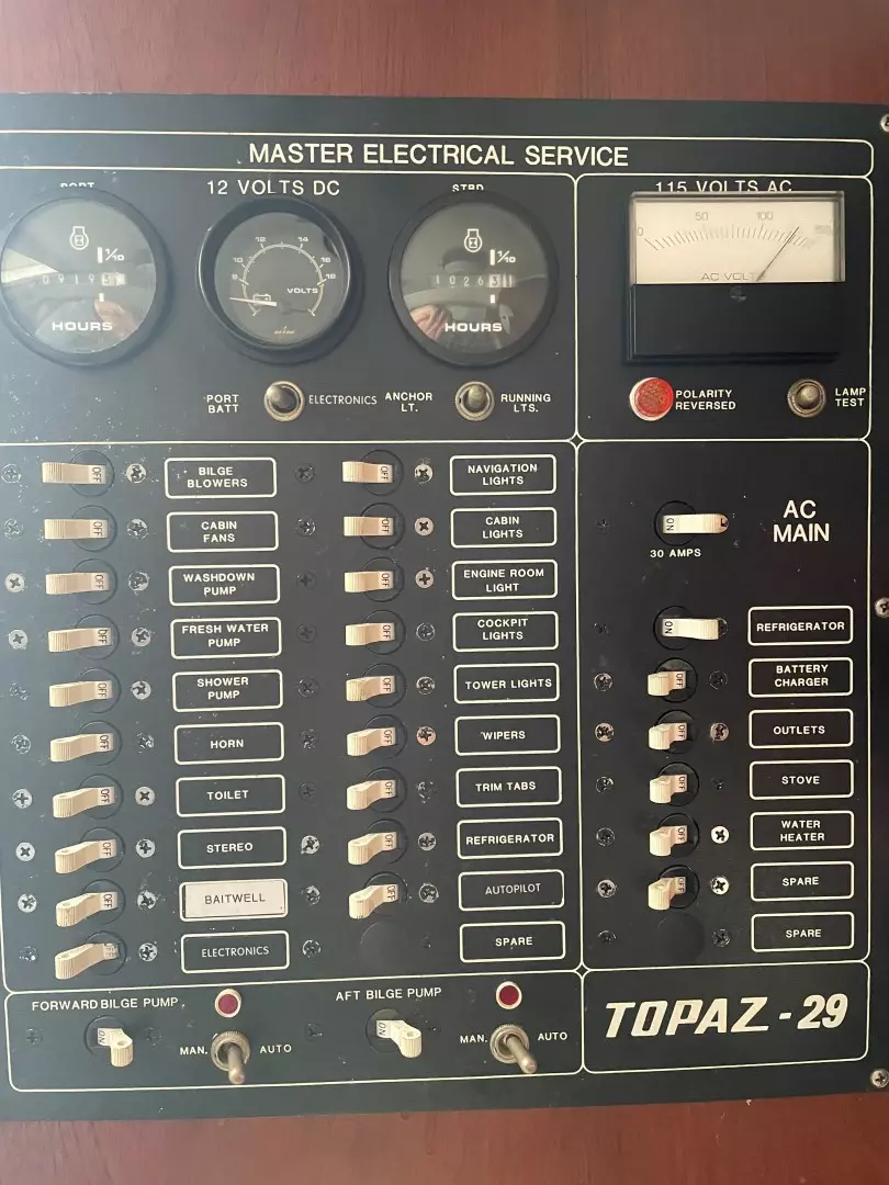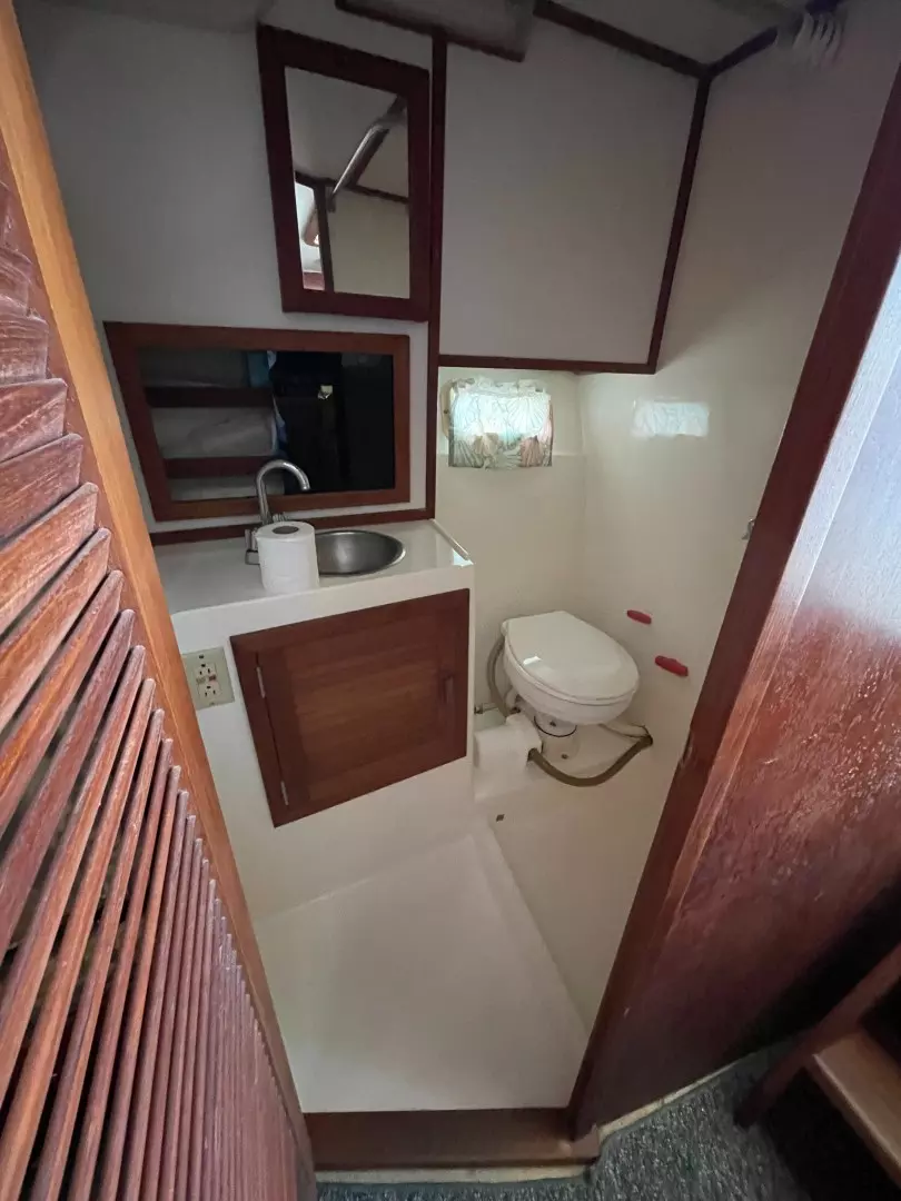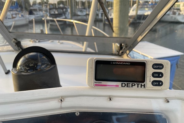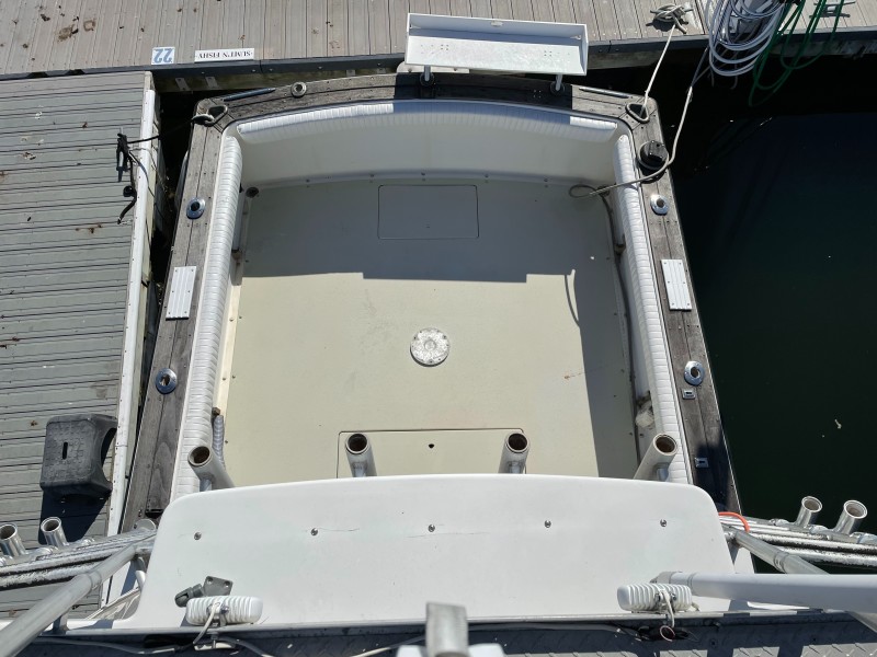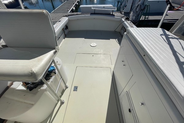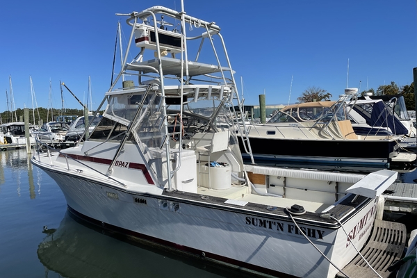 "SUMT"N FISHY" is a reliable fishing machine!!! Powered by twin Volvo 5.7L engines that are fresh water cooled with direct transmission and 1026hrs. The 29's bi-level cockpit dominates the layout and measures about half of the boat's overall length. The engines are located beneath the bridge deck, and there's room for a full-size marlin chair in the aft cockpit where a large insulated fish box is built into the sole. Below, the cabin accommodations are simple and straightforward with upper and lower berths forward that sleep three, an enclosed head, and a compact galley with stove, sink and refrigerator. Recognized as a competent and good-handling offshore fisherman, "SUMT'N FISHY" is MUST-SEE.
