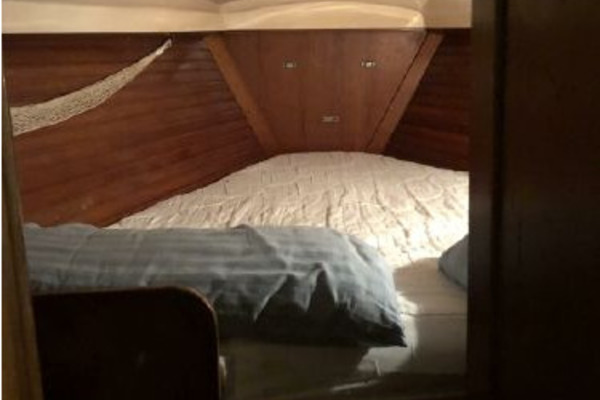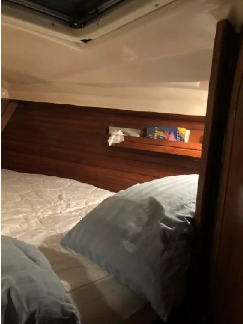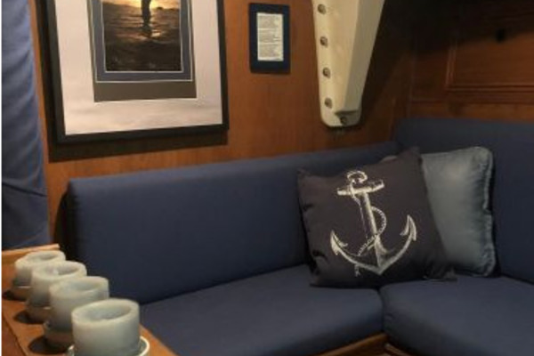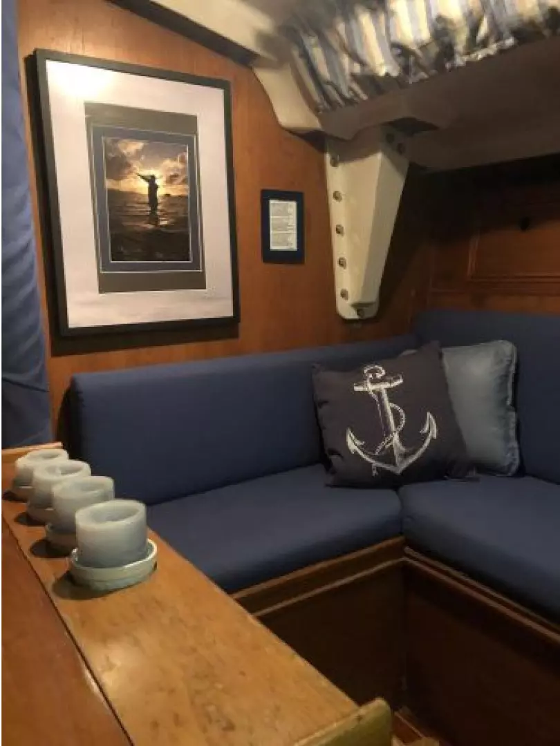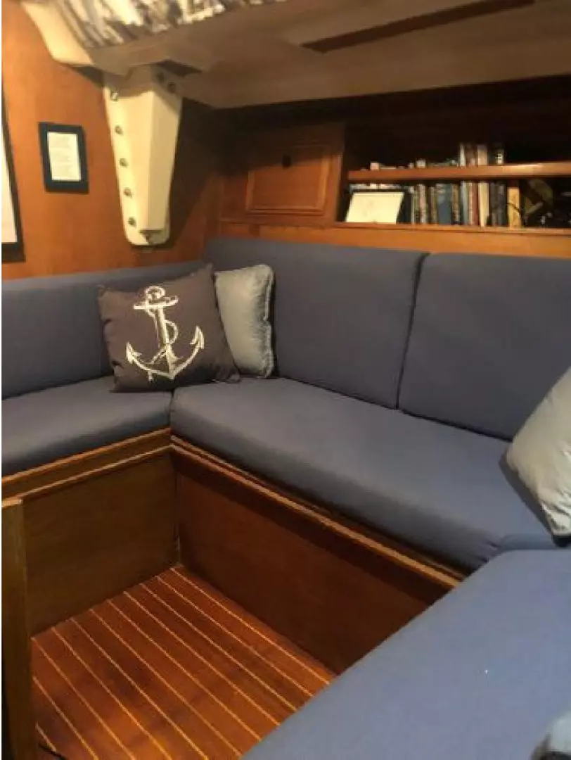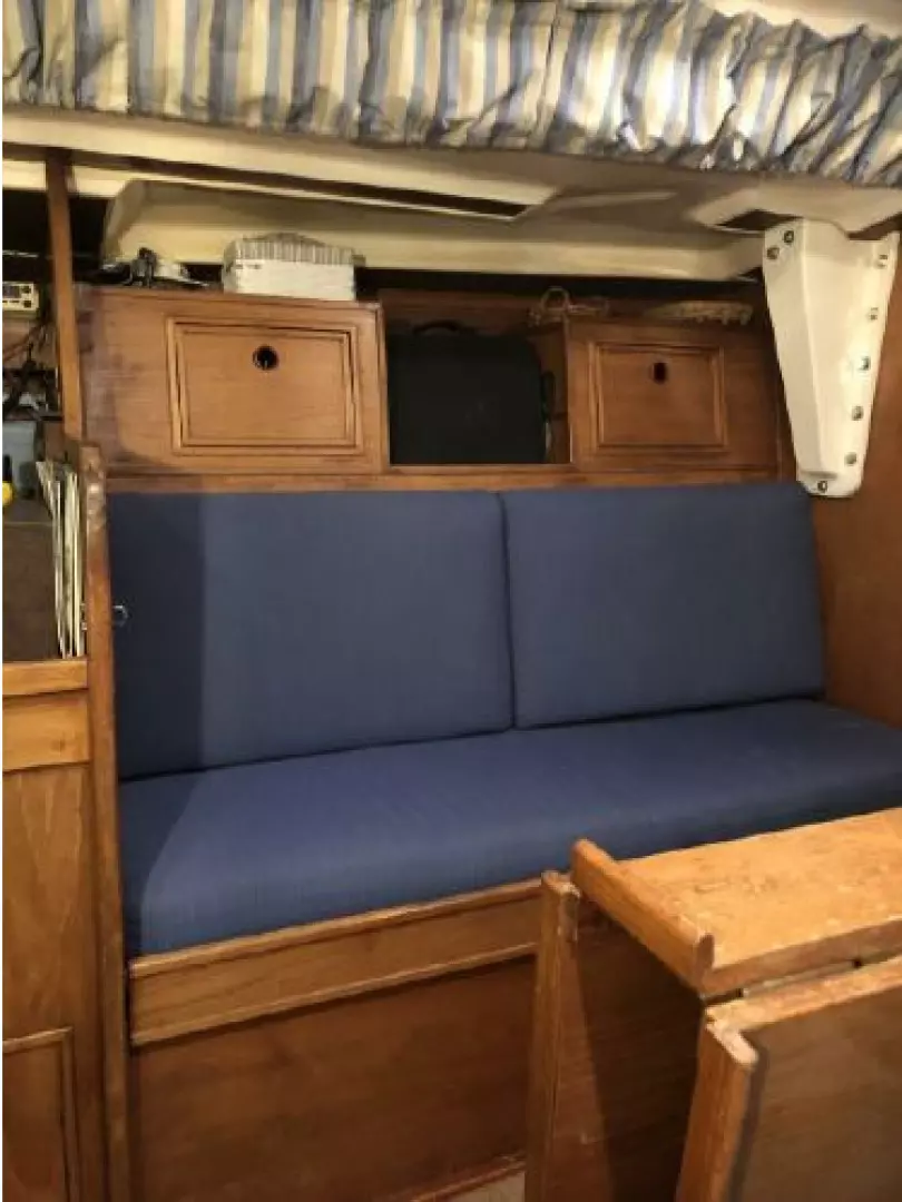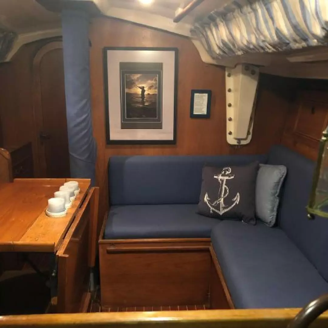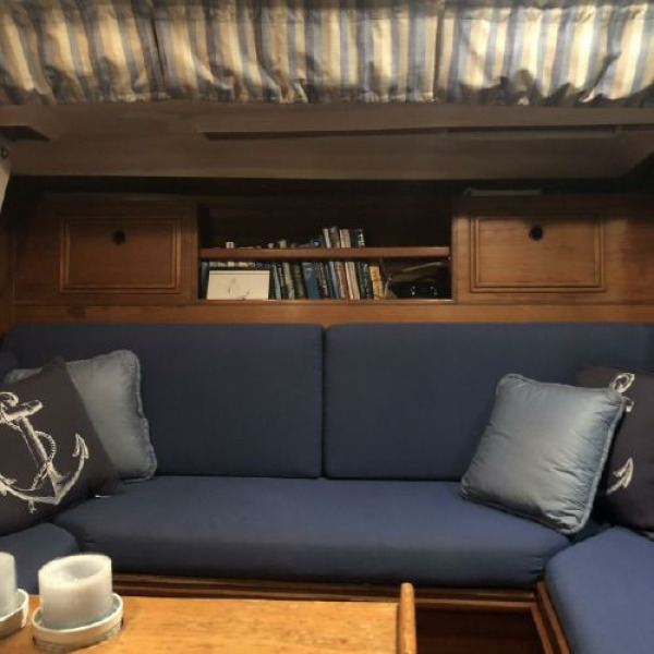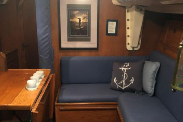 - Double drop leaf table on center line with large wrap around settee to starboard