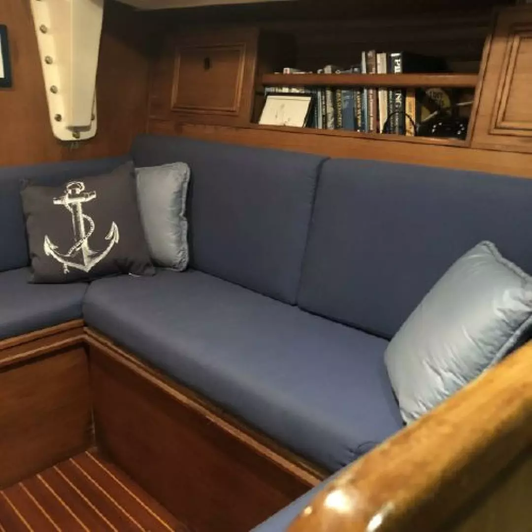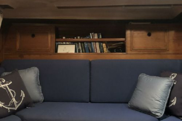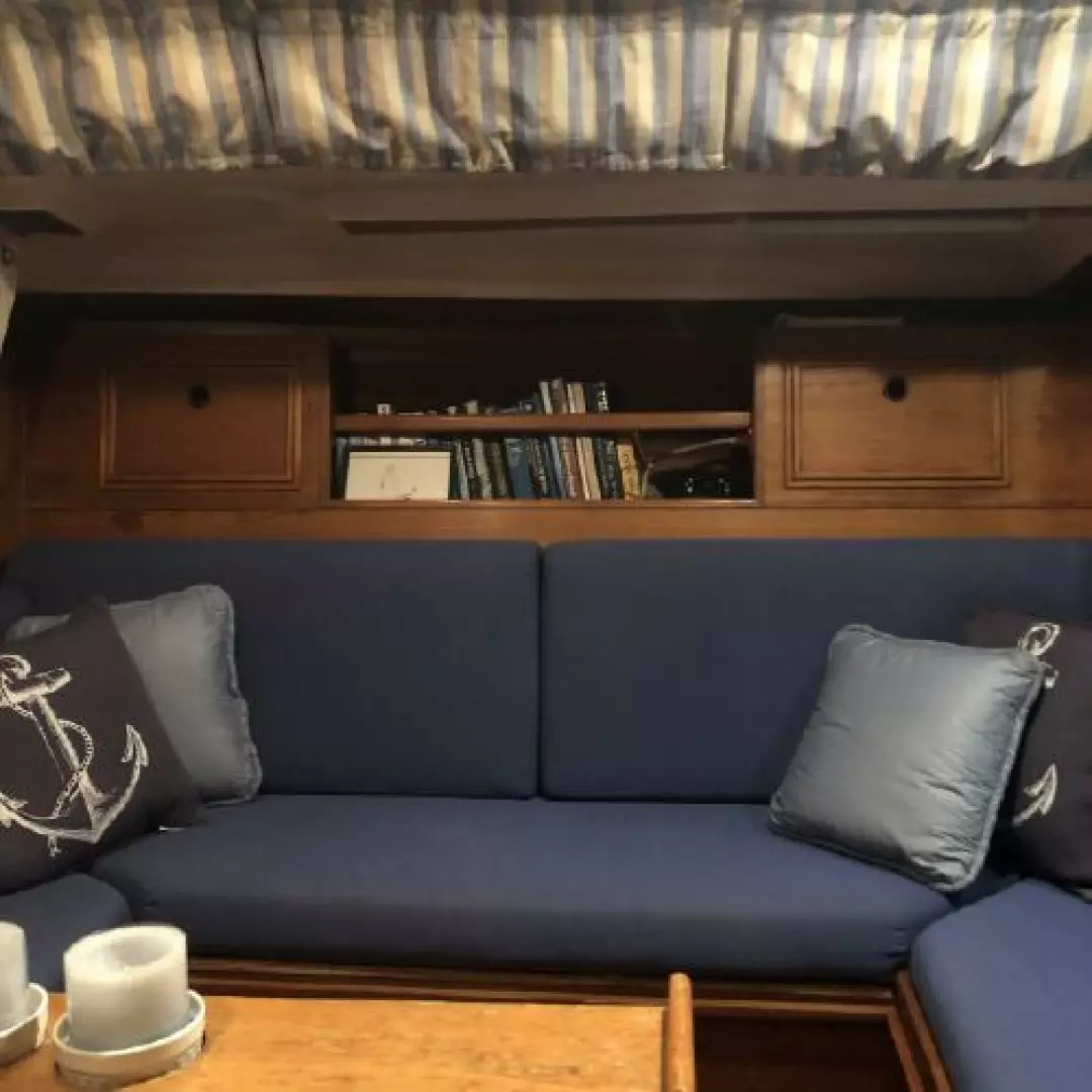 - Dodger, bimini, stretcher panel and mainsail cover in blue Sunbrella (2010)
