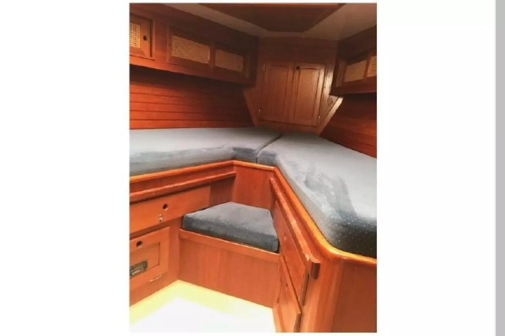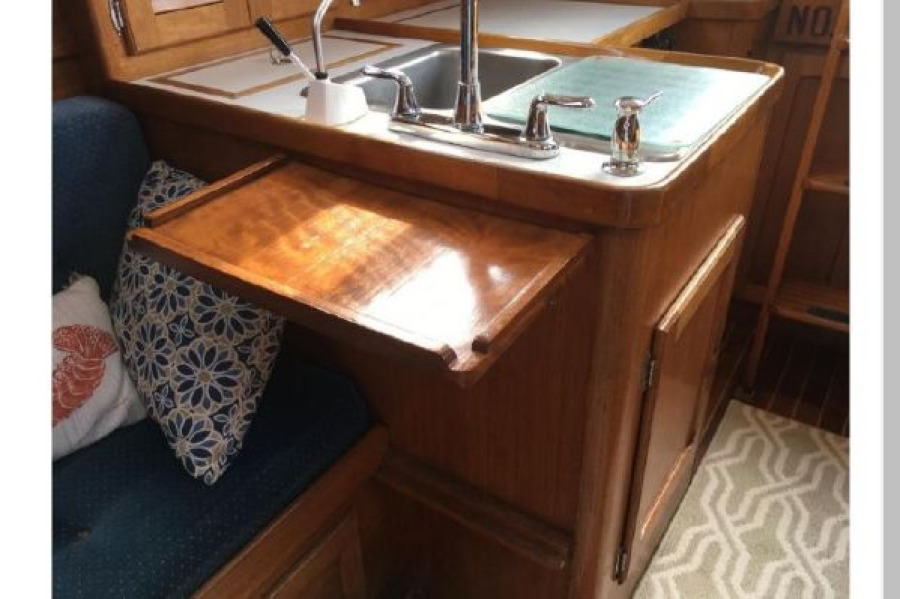 Varnished teak bulkhead mounted table with two folding leafs. Port and starboard settees which convert to double berths with storage under, above and behind. Wet locker, Nav station, and large quarter berth. Large Bomar hatches , 4 opening ports w/screens, and dorade vent. Teak and ash sole throughout. "Casco" has the upgraded Bristol interior with U-shaped galley, louvered locker fronts and varnished teak throughout.