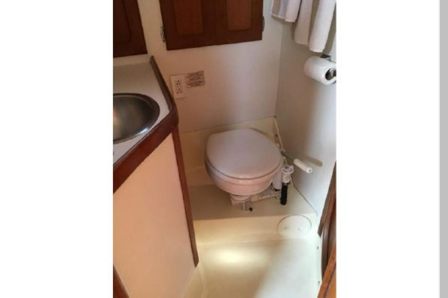 Head with large varnished mirror. Hot and cold pressure water, Raritan PH II manual head with Y-valve and holding tank, all odor-free hoses, and opening screened port and dorade vent. Deck pump out for holding tank.