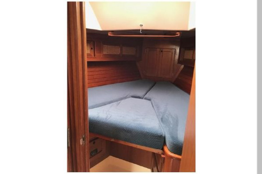 From the bow; V-berth with center filler, storage in drawers and behind cane and teak faced sliding cabinet doors, teak and ash sole, access to head to port. To starboard are 3 storage drawers and a shelf. Forward access to the anchor well is through teak doors.