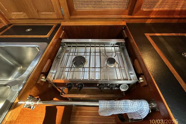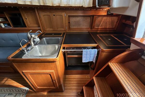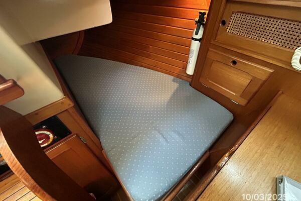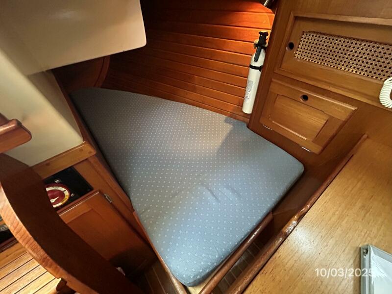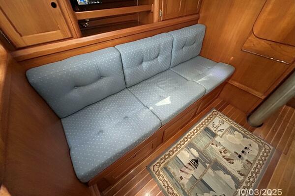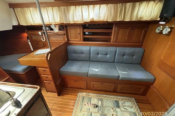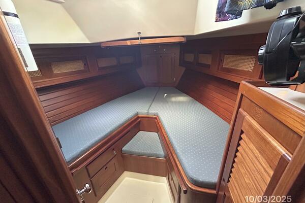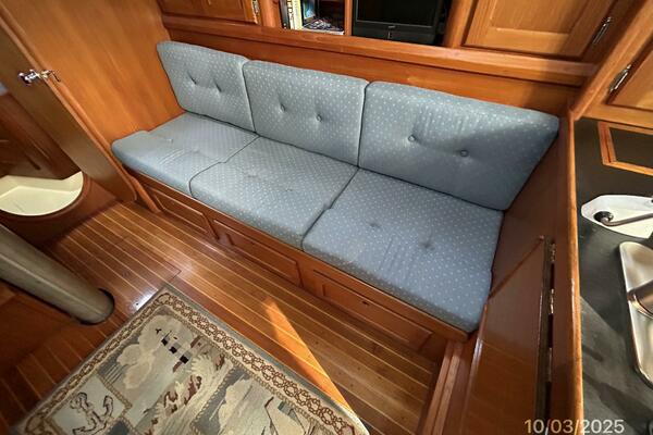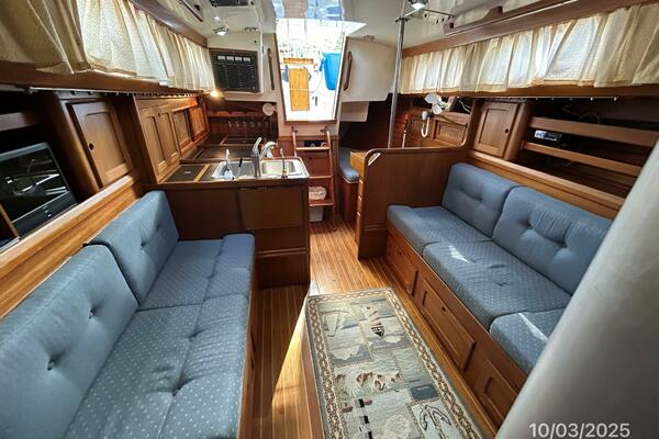 The salon offers a teak & holly sole, 4 side windows, 2 portlights, curtains, overhead hatch, fold-down table forward, reading lights, shelves, storage cabinets, fan, auxiliary access and a benchseat /berth with storage on each side forward.