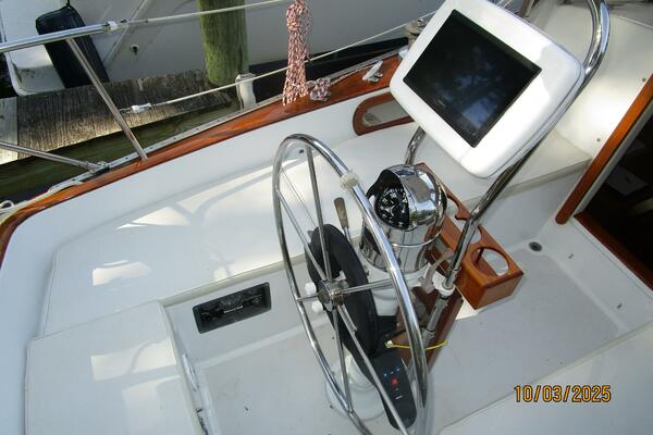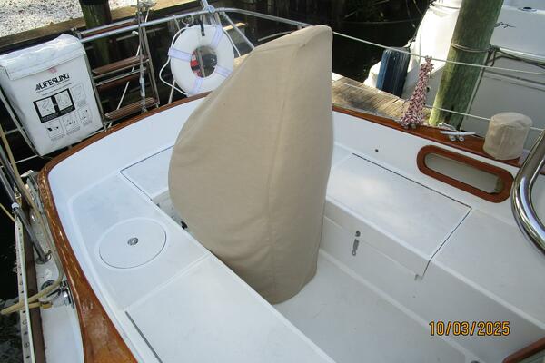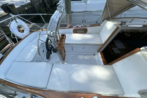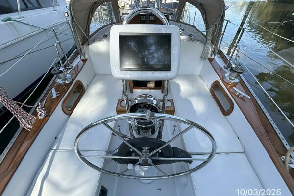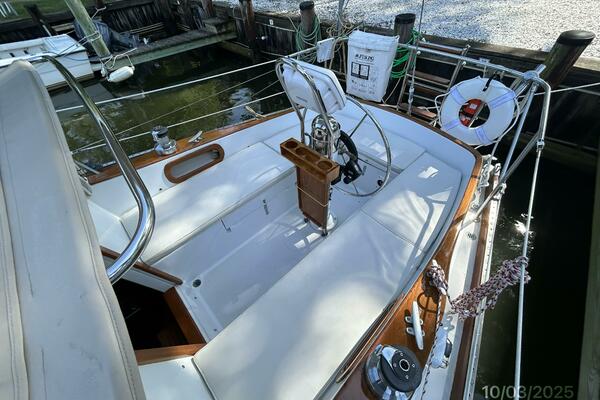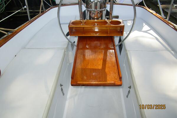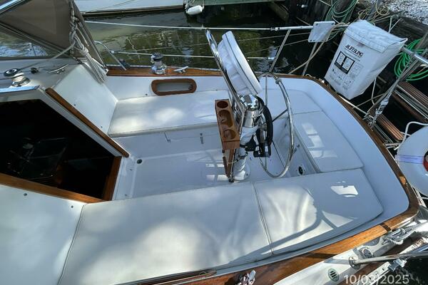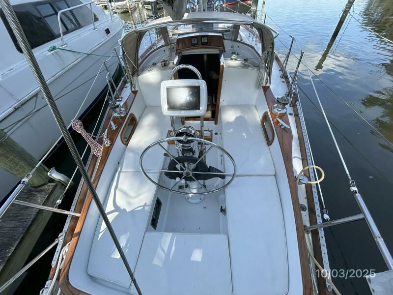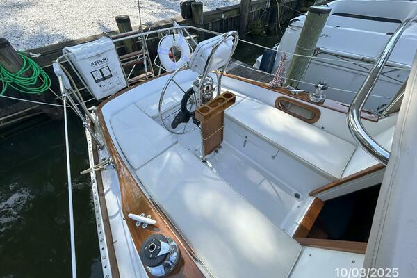The cockpit offers a non-skid deck, dodger, seating on each side and aft with cushions, teak cap rail, fold-up table, Edson helm pedestal and steering wheel and propane locker starboard aft.