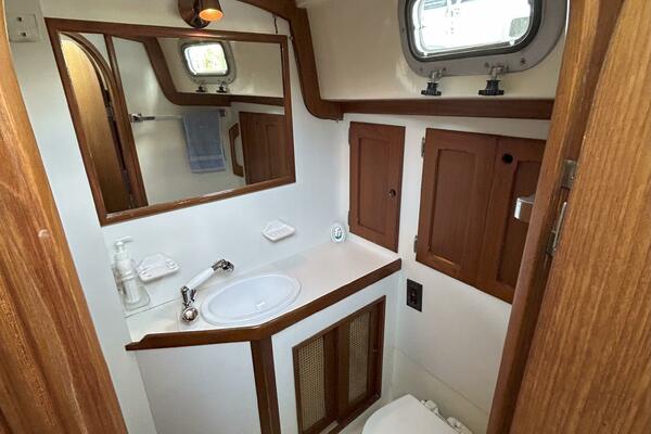 The stateroom is forward and offers a v-berth with an insert, storage cabinets and drawers, hanging locker, storage under the berth, reading lights, overhead hatch, portlight, non-skid deck and fan.