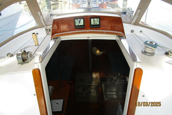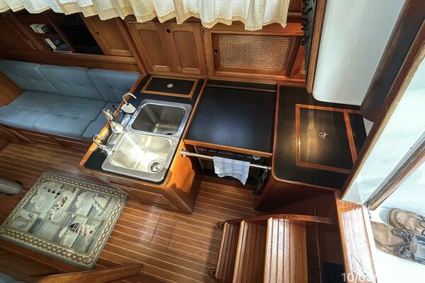 From the cockpit, you step down the compaionway into the salon to find the galley starboard aft, benchseat/berth with storage starboard forward, fold down table forward, benchseat/berth with storage port forward, nave station to port and a quarter berth port aft. The head is port forward and the stateroom with a v-berth and insert is forward. Auxiliary access is via removing the companionway steps.