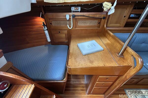The nav station is to port in the salon and offers a desk, storage, benchseat and a Standard horizon Eclipse VHF.